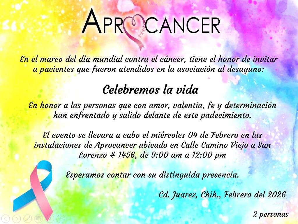 Ciudad Juárez. — En un emotivo encuentro para honrar la resiliencia y la esperanza, la asociación Aprocáncer llevará a cabo el desayuno "Celebremos la Vida".