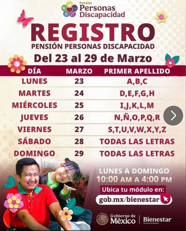 Chihuahua.- El registro para la Pensión para el Bienestar de las Personas con Discapacidad se encuentra abierto del 23 al 29 de marzo en el estado de Chihuahua, como parte de la convocatoria impulsada por el Gobierno de México.