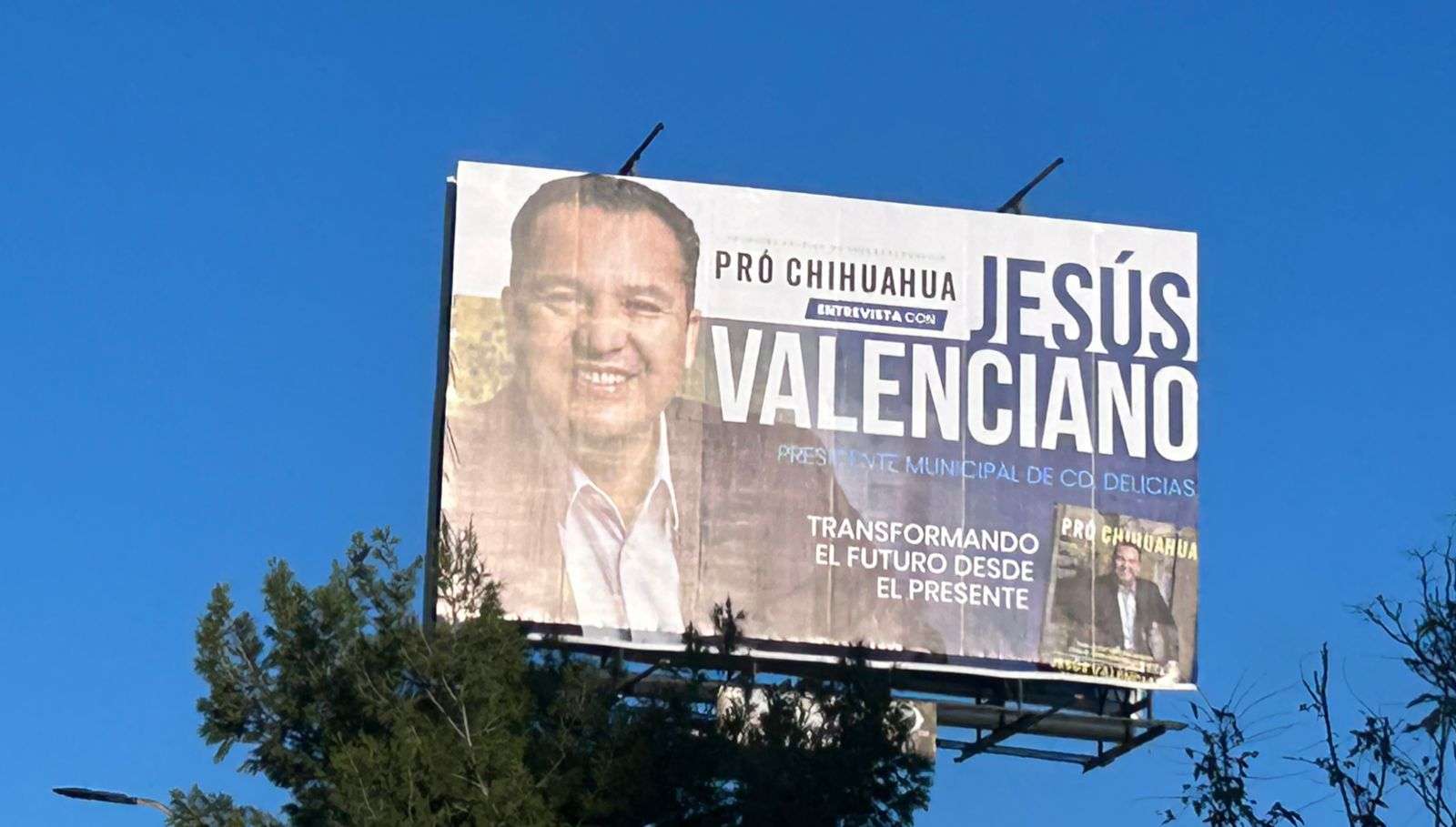 Chihuahua.- Un espectacular con la imagen del alcalde de Delicias, Jesús Valenciano García, fue colocado sobre el corredor La Cantera para promocionar una entrevista en la revista Pro Chihuahua, acción que generó interpretaciones sobre un eventual intento de posicionamiento político rumbo a futuros procesos electorales.