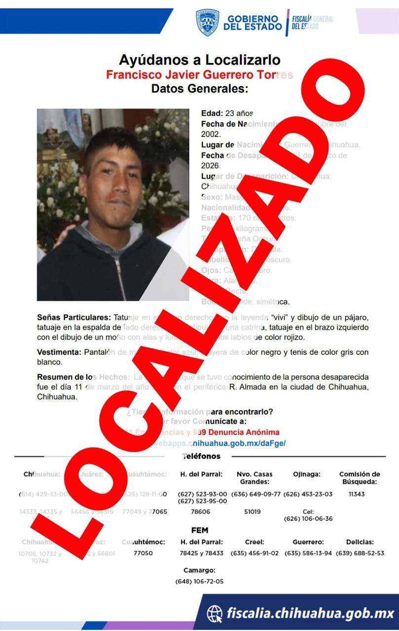 Chihuahua. - La Unidad de Investigación de Personas Ausentes y/o No Localizadas de la Fiscalía de Distrito Zona Centro (FDZC) encontró sano y salvo a Francisco Javier G. T., 23 años de edad