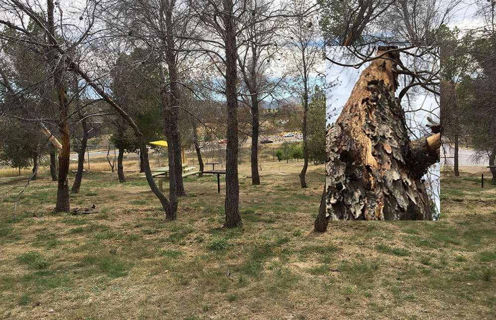 Chihuahua.- En las redes sociales se reportó que más de 50 pinos del parque El Reliz se han visto afectados por una plaga en menos de seis meses.