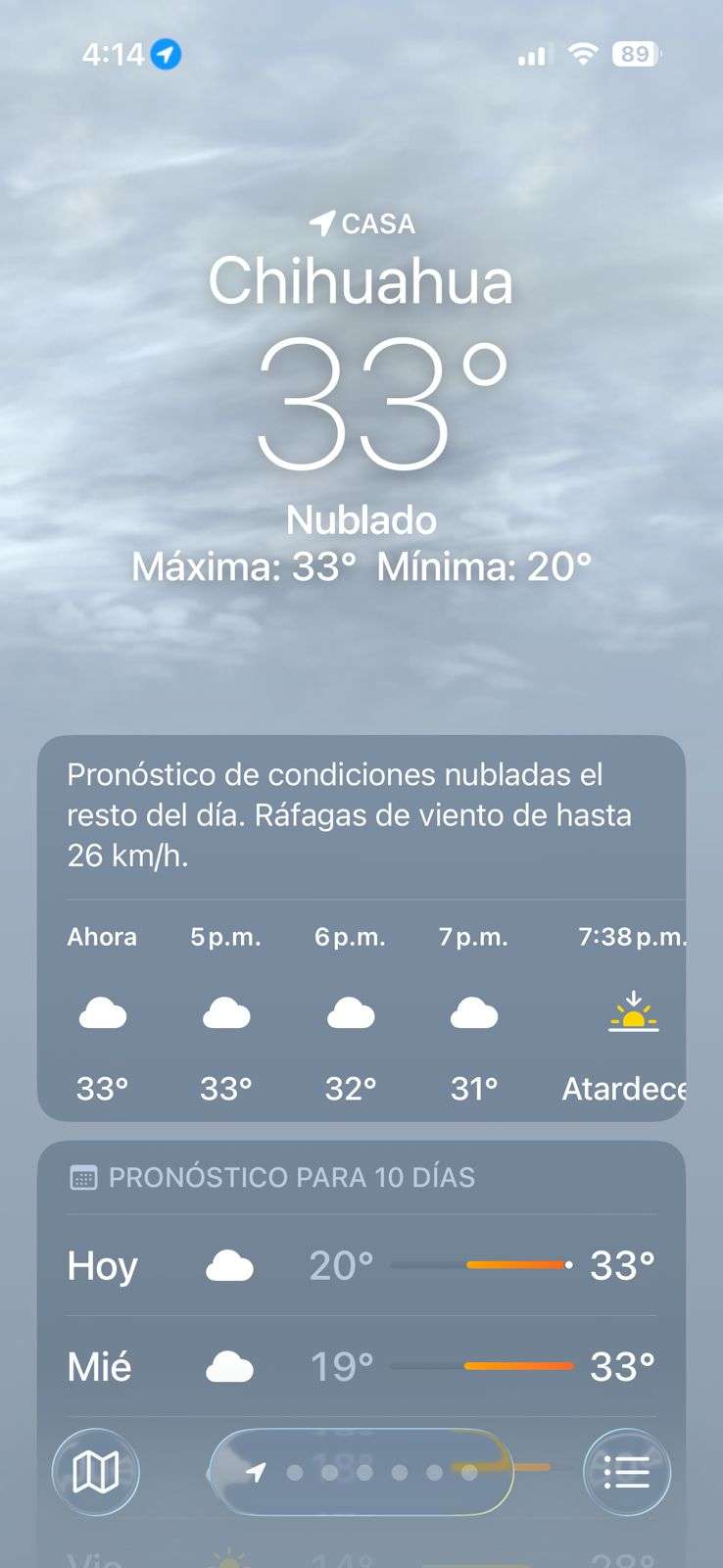Chihuahua.- Un ambiente sofocante predomina la tarde de este martes en la capital del estado, luego de que el termómetro alcanzara los 33 grados centígrados y la velocidad de los vientos se redujera a apenas 11 kilómetros por hora, limitando la circulación de aire en la ciudad.