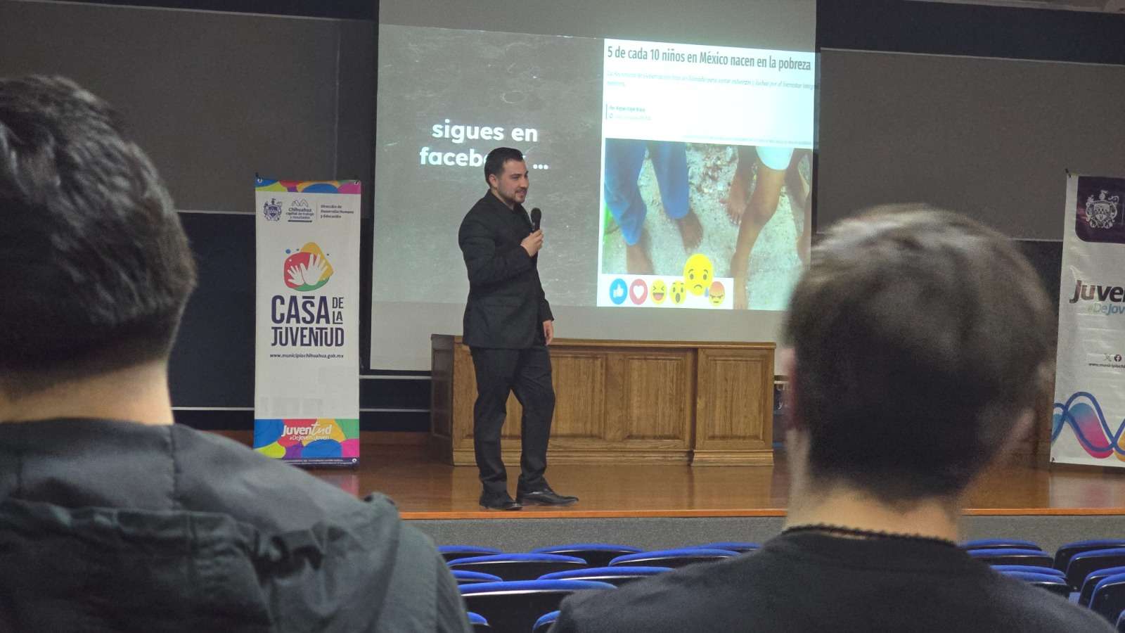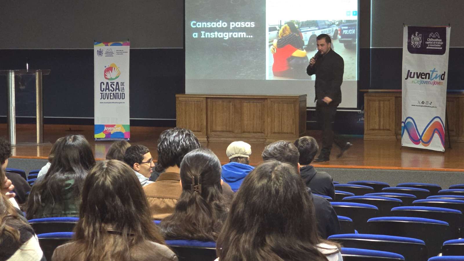 Chihuahua, Chih.- El Gobierno Municipal de Chihuahua, a través de la Dirección de Desarrollo Humano y Educación, llevó la conferencia “Liderazgo con propósito” en la Facultad de Medicina y Ciencias Biomédicas y en la Facultad de Ingeniería de la UACH, donde se abordaron problemáticas reales que enfrentan las y los jóvenes, así como la manera en que reaccionan ante estos desafíos.