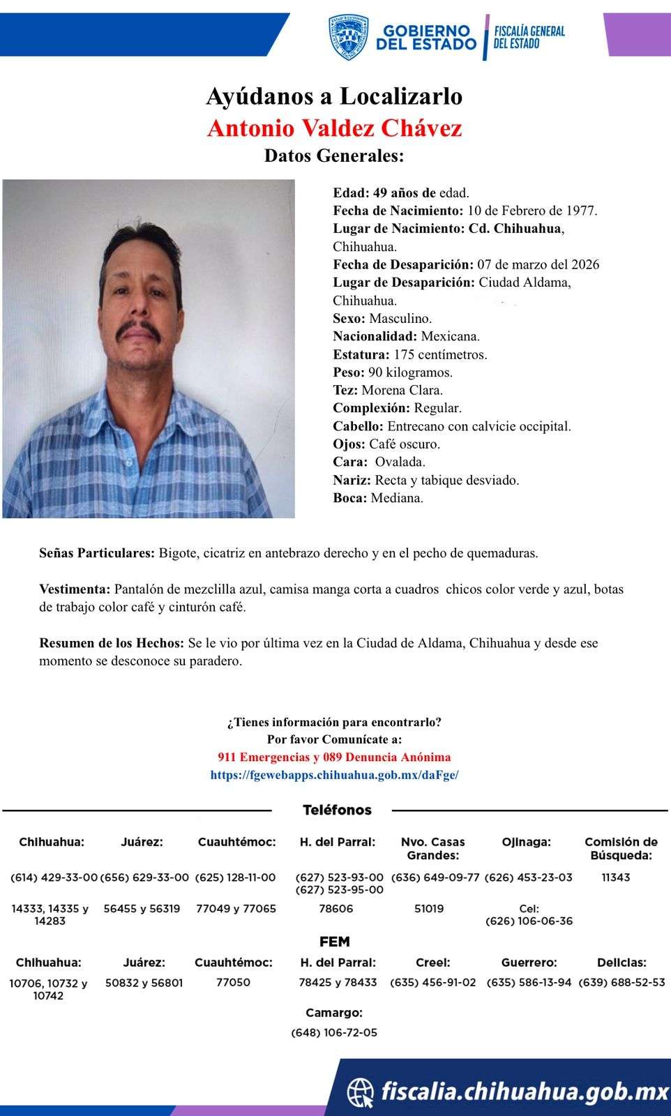 Aldama. – Familiares y autoridades solicitan el apoyo de la ciudadanía para localizar a Antonio Valdez Chávez, de 49 años de edad, quien fue visto por última vez este sábado 7 de marzo de 2026 en la ciudad de Aldama, Chihuahua.