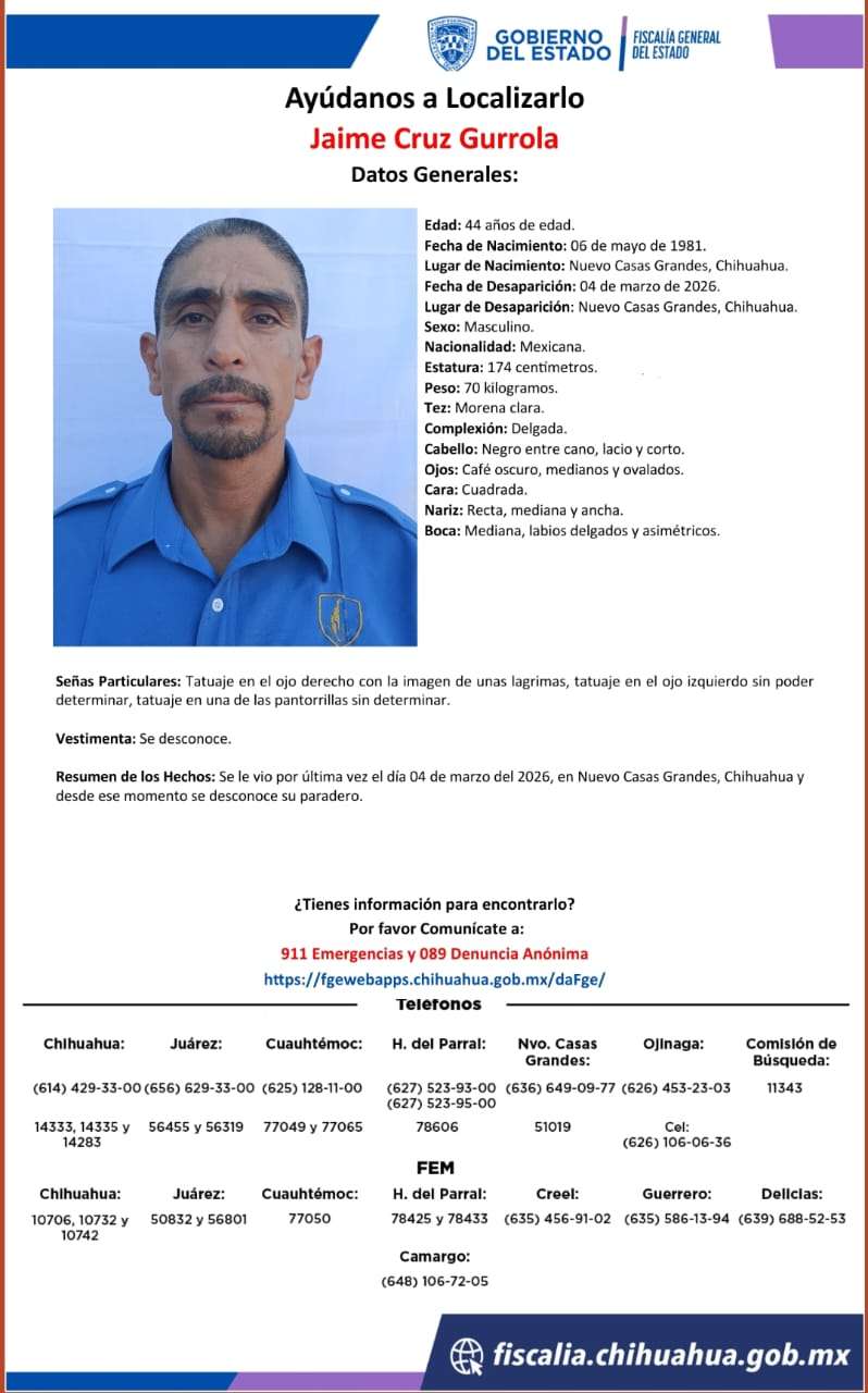 Nuevo Casas Grandes, Chih.– Autoridades solicitan el apoyo de la comunidad para localizar a dos personas reportadas como extraviadas este 4 de marzo en el municipio de Nuevo Casas Grandes.