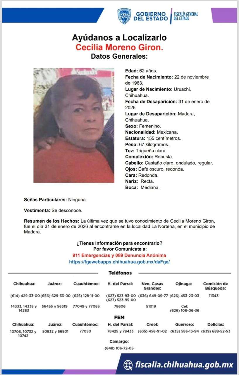 Cuauhtémoc.- La Fiscalía de Distrito Zona Occidente, a través de la Agencia Estatal de Investigación realizó un rastreo de búsqueda de cuatro personas que cuentan con reportes de desaparición interpuestos el 31 de enero del año en curso.