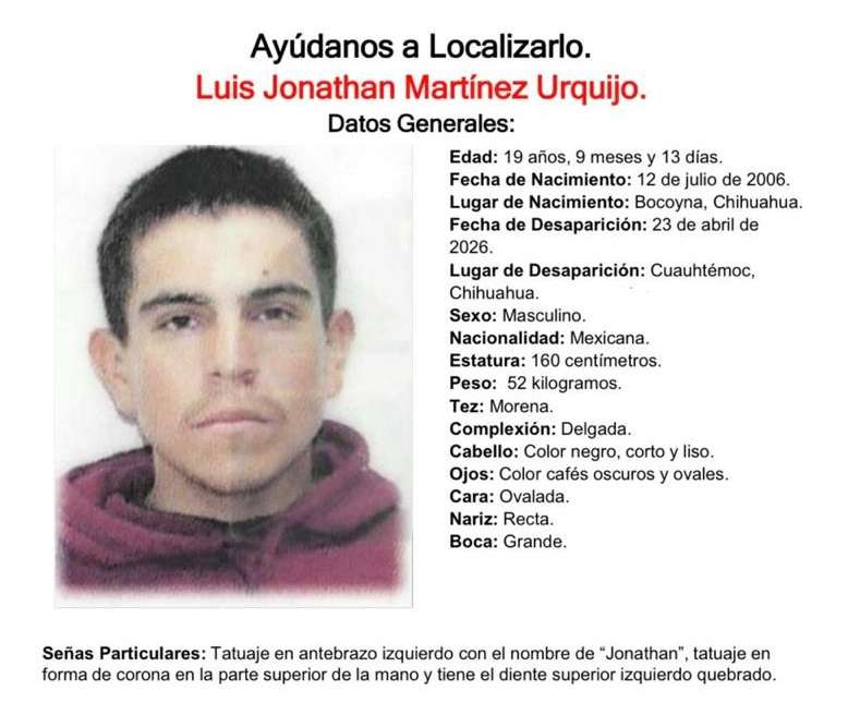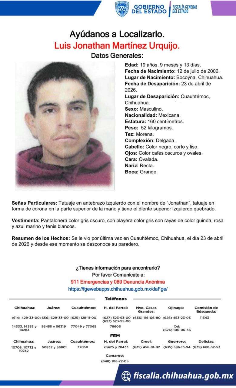 Cuauhtémoc, Chih. - La Fiscalía General del Estado solicita la colaboración de la ciudadanía para localizar al joven Luis Jonathan Martínez Urquijo, de 19 años de edad, quien desapareció el pasado 23 de abril de 2026 en el municipio de Cuauhtémoc.