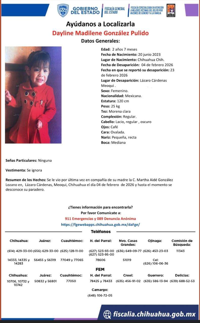 Meoqui, Chih.– Autoridades  solicitan el apoyo de la ciudadanía para localizar a Martha Aidé González Lozano, de 22 años de edad, y a su hija Dayline Madilene González Pulido, de 2 años, quienes fueron reportadas como desaparecidas el pasado 4 de febrero en la localidad de Lázaro Cárdenas, municipio de Meoqui.