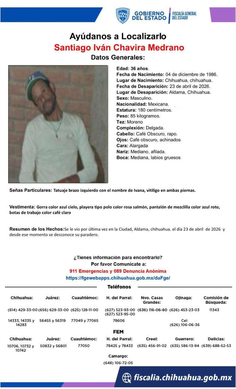Aldama, Chih. - La Fiscalía General del Estado (FGE) emitió una pesquisa urgente para localizar a Santiago Iván Chavira Medrano, de 36 años de edad, quien fue visto por última vez el pasado 23 de abril de 2026 en la ciudad de Aldama, Chihuahua.