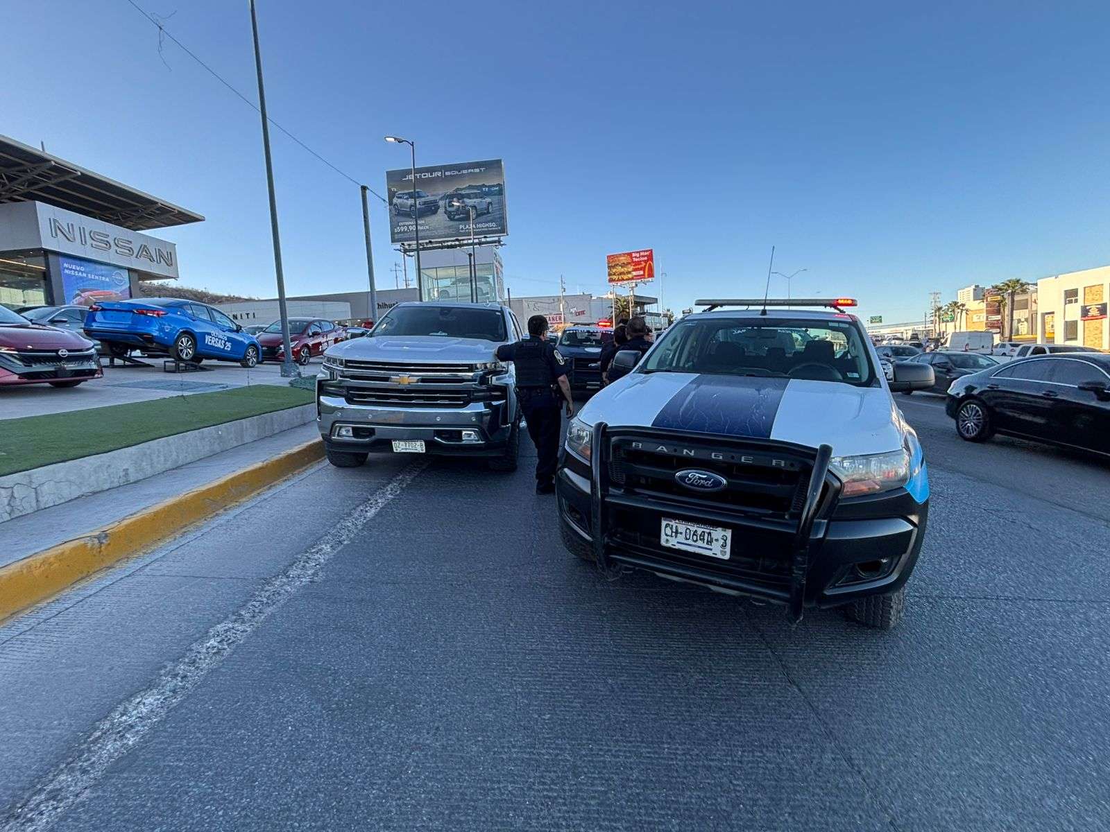 El presunto asaltante condujo inicialmente por la avenida Homero y viró hacia el sentido sur-norte del Periférico de la Juventud; sin embargo, al llegar a la altura de la agencia de autos Jidosha, los oficiales le cerraron el paso y efectuaron la detención.