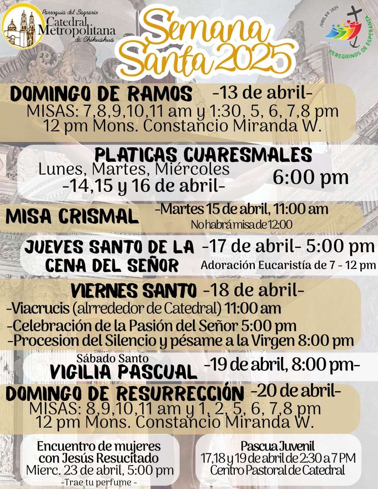 Chihuahua.- En la Catedral Metropolitana, de acuerdo con la tradición religiosa, este Jueves y Viernes Santo se llevarán a cabo varias actividades relacionadas con la Semana Santa.