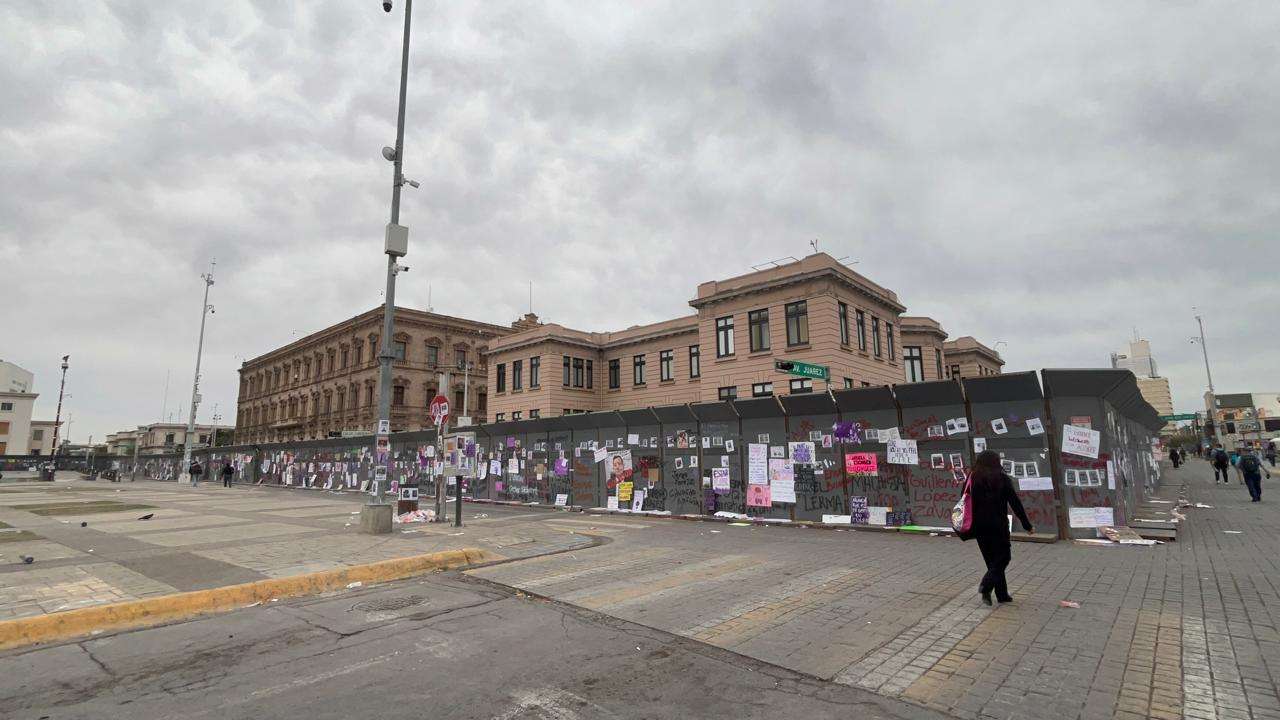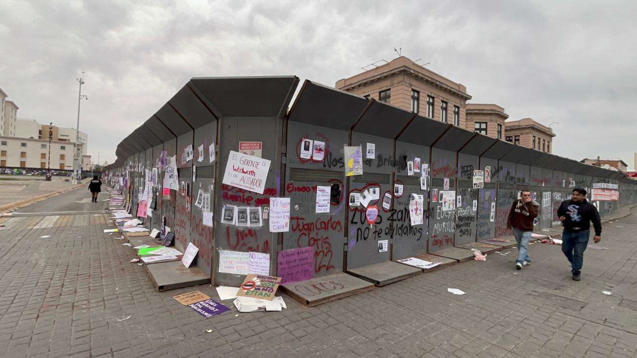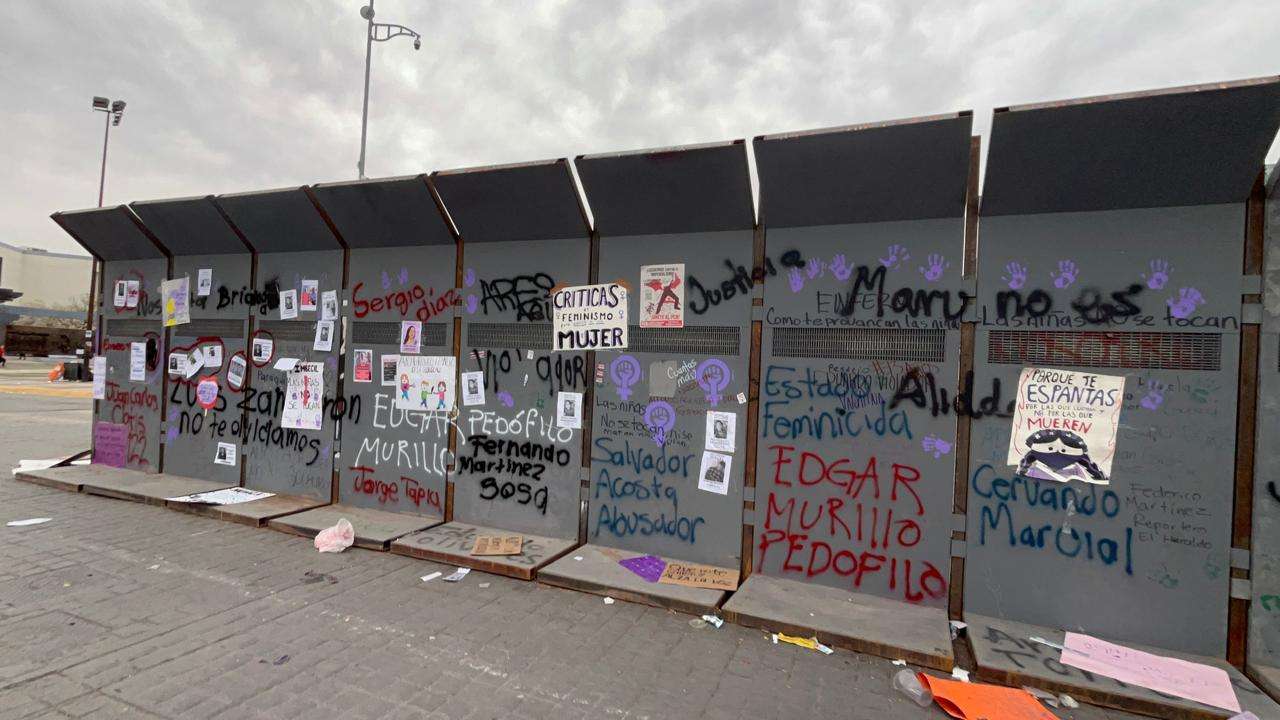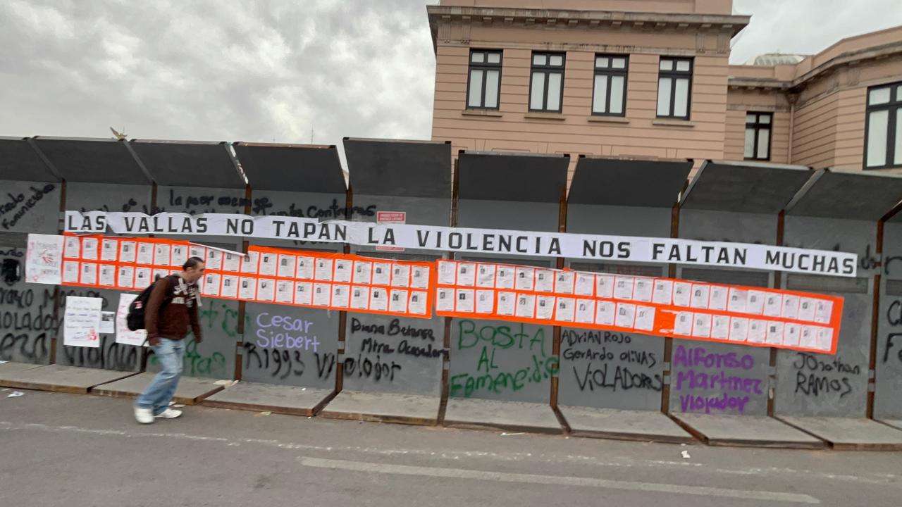 Las vallas no solo cumplen su función de barrera física, sino que ahora sirven como un recordatorio visual de la reciente movilización por el Día Internacional de la Mujer.