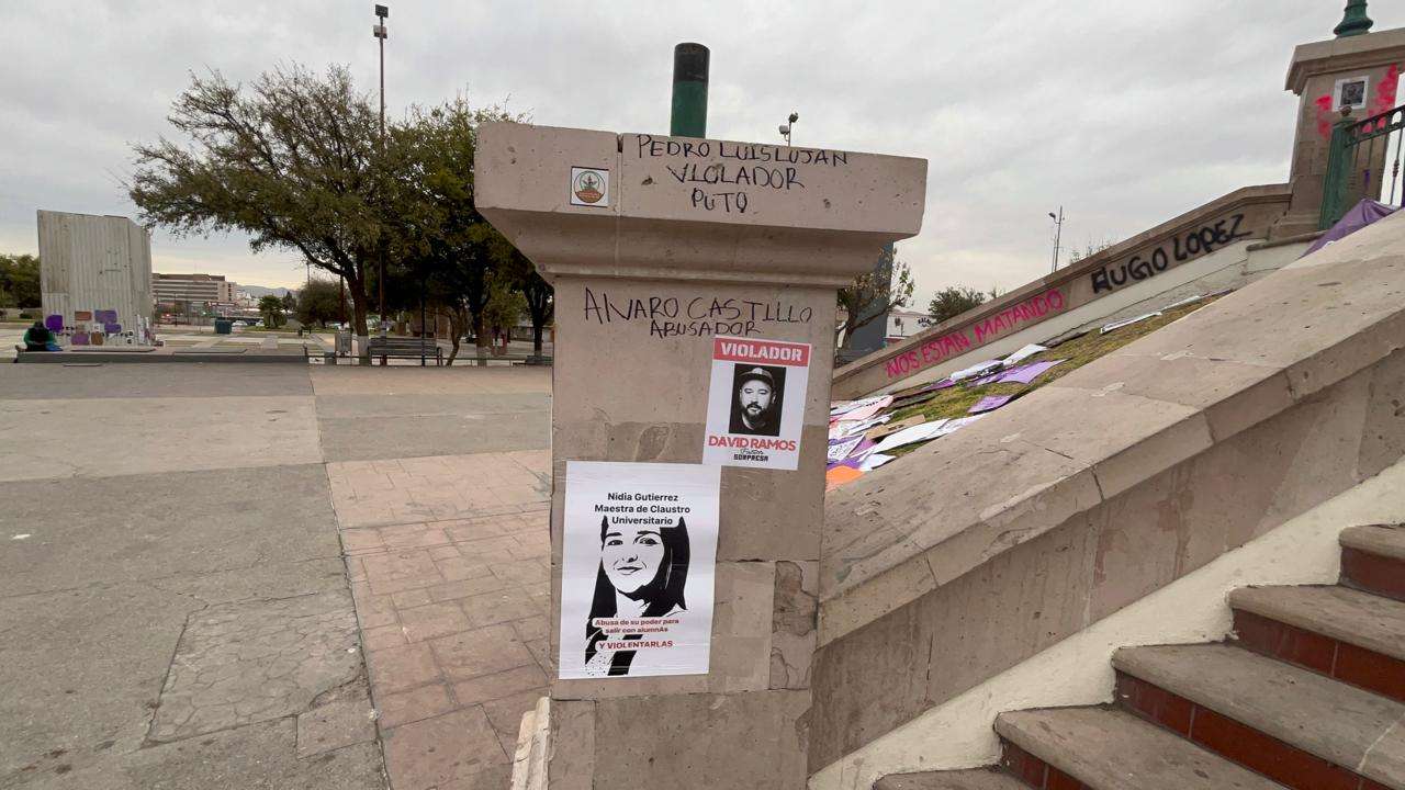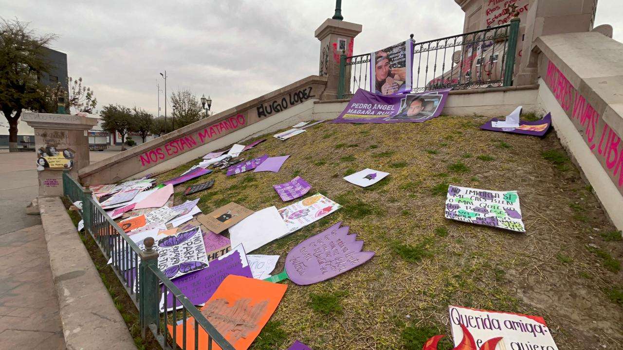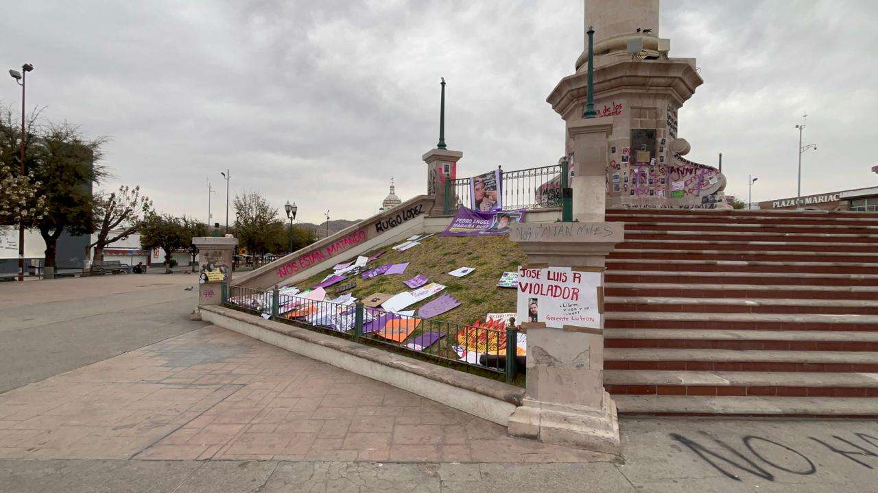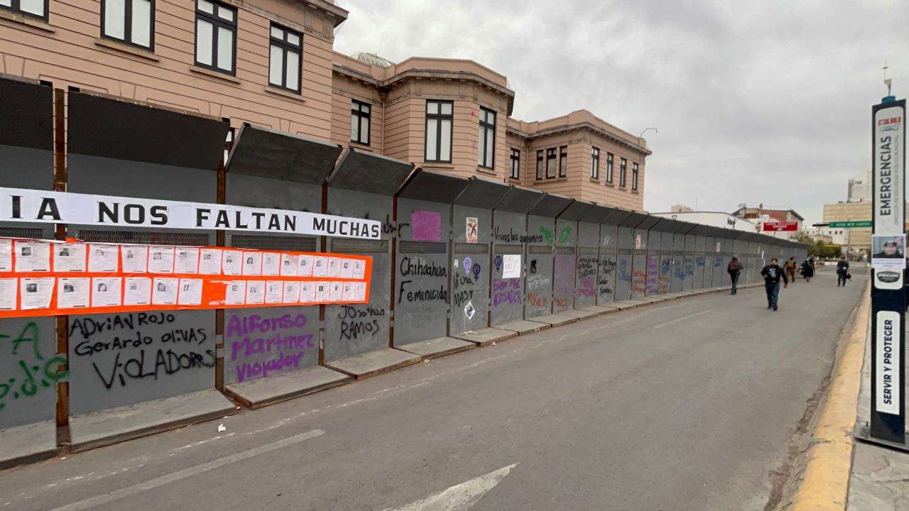 Las vallas no solo cumplen su función de barrera física, sino que ahora sirven como un recordatorio visual de la reciente movilización por el Día Internacional de la Mujer.