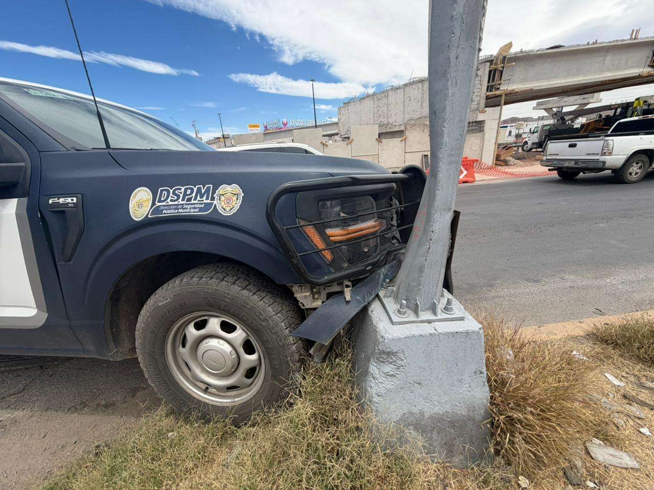 Chihuahua. - Una patrulla de la Dirección de Seguridad Pública Municipal protagonizó un choque contra un poste de alumbrado público esta tarde, al norte de la ciudad.
