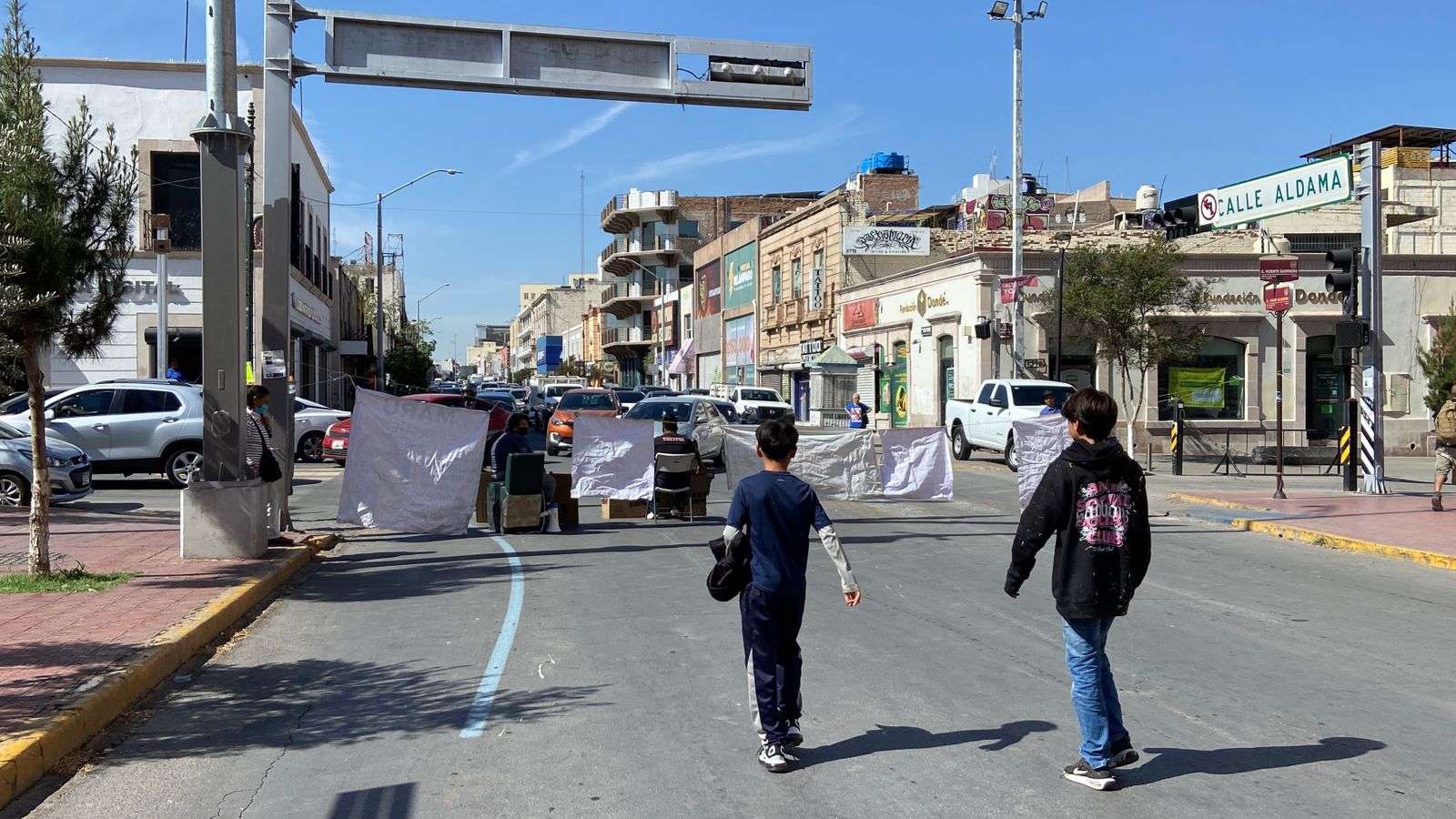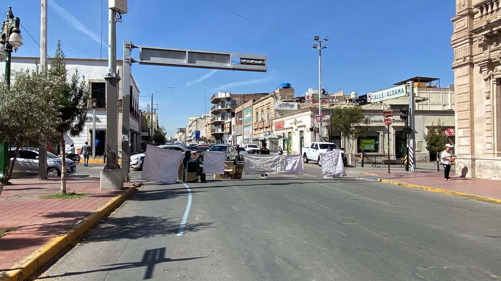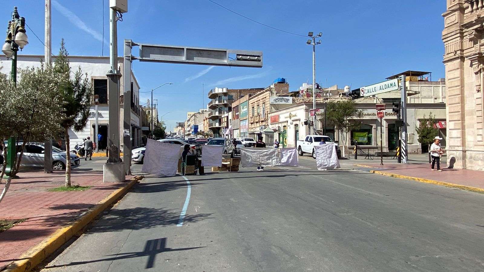 Ayudados por lonas y una camioneta cerraron la calle Aldama a la altura de la calle Vicente Guerrero, por lo que se está haciendo un gran congestionamiento vial.