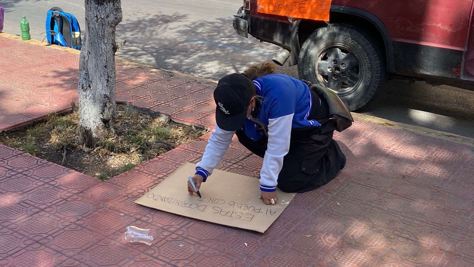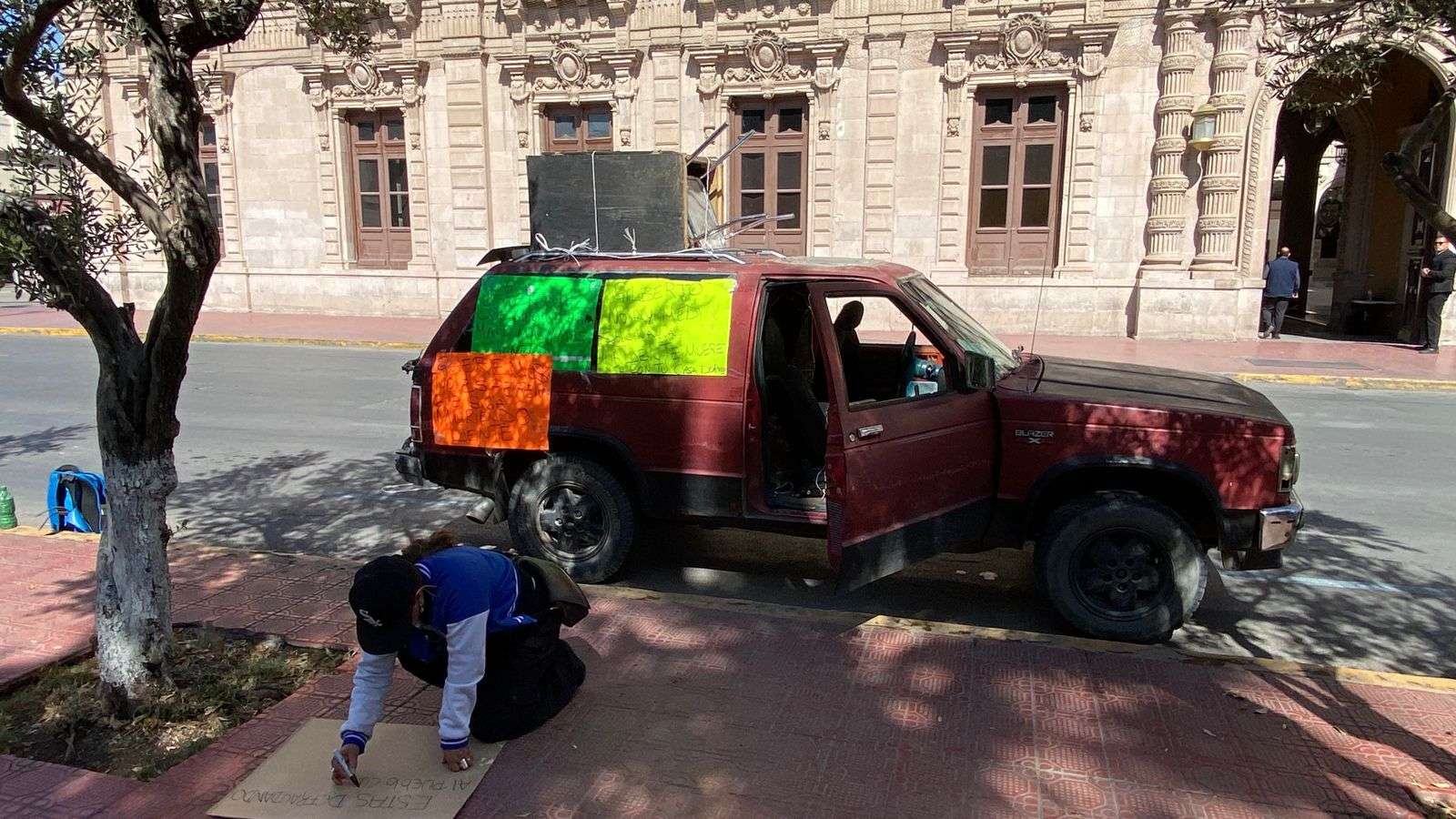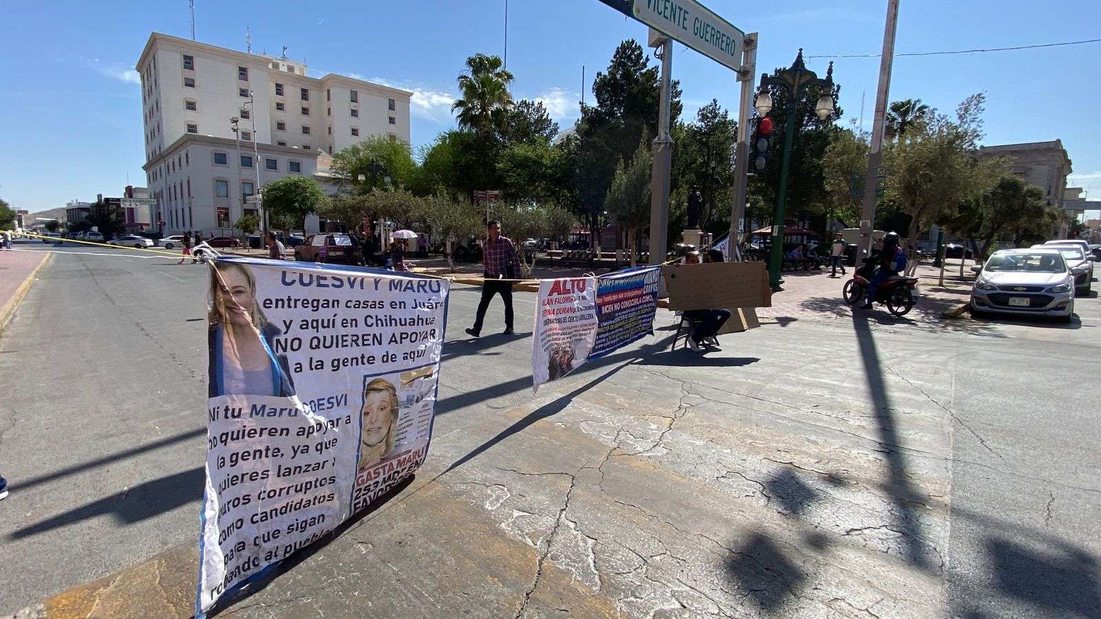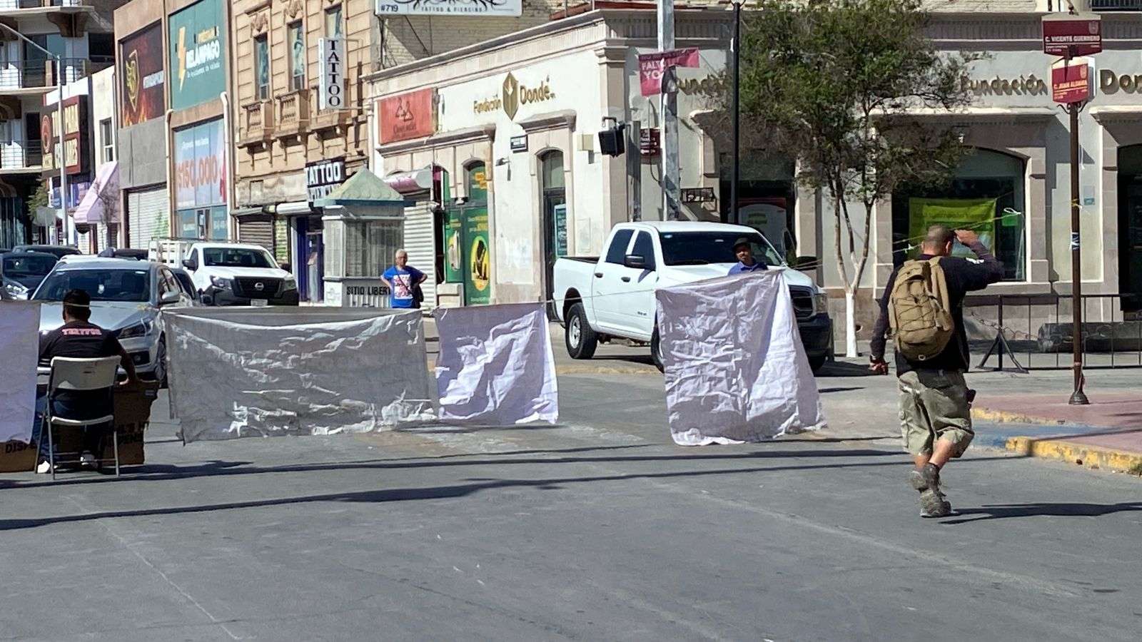 Ayudados por lonas y una camioneta cerraron la calle Aldama a la altura de la calle Vicente Guerrero, por lo que se está haciendo un gran congestionamiento vial.