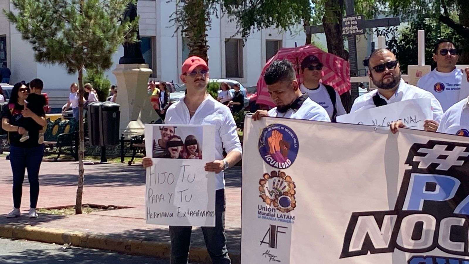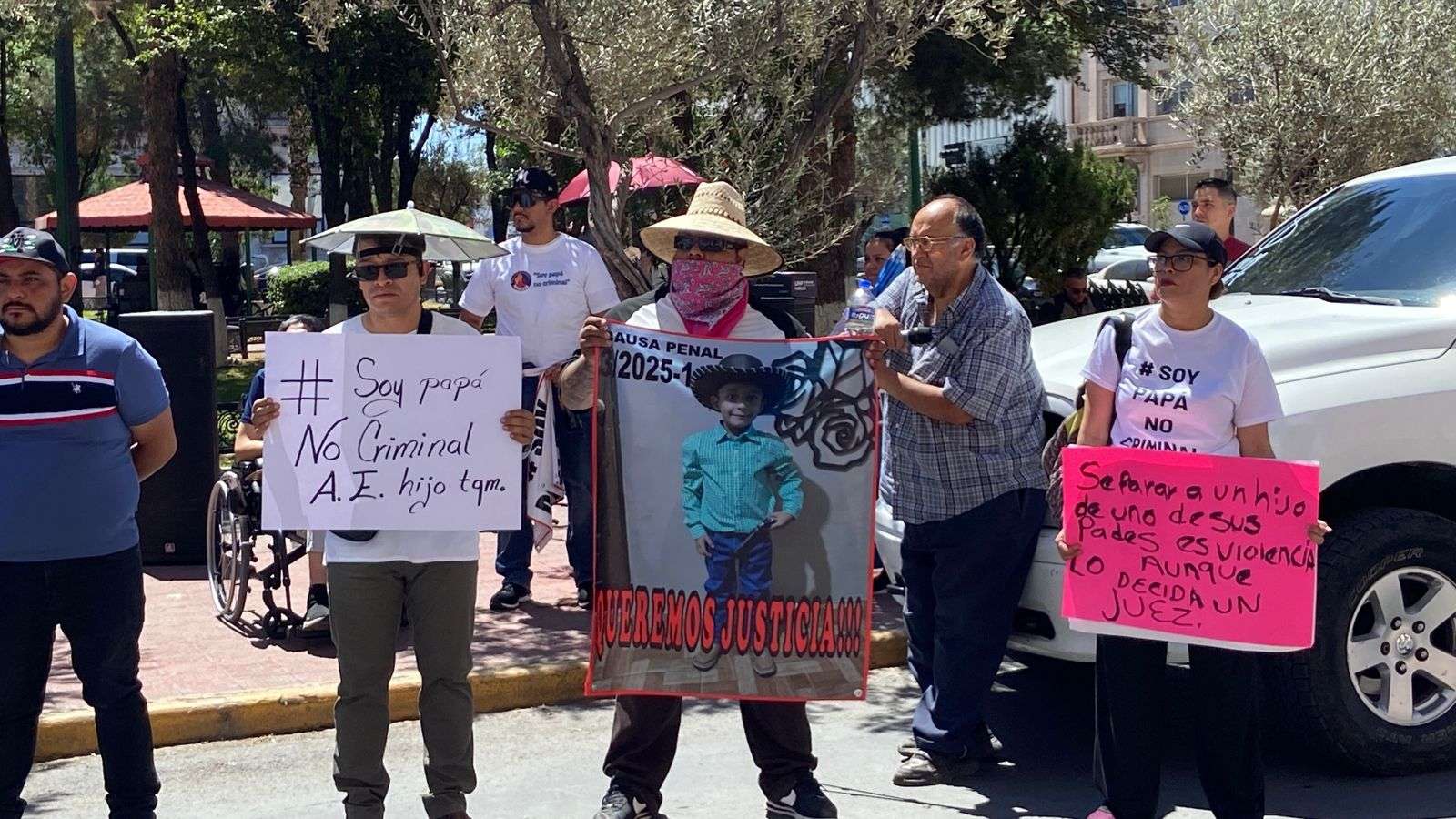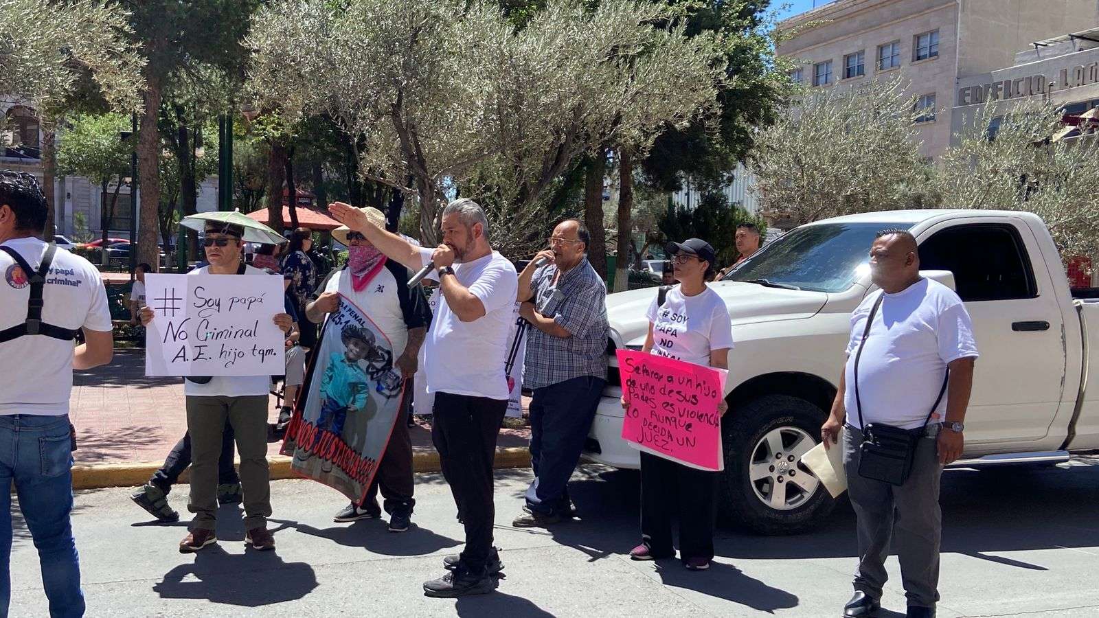 Chihuahua.- Padres de familia del colectivo Soy papá no criminal, exigieron en Palacio de Gobierno que sean investigadas las denuncias falsa que han hecho hacia ellos para no ver a sus hijos, al grito de Soy papá no criminal.