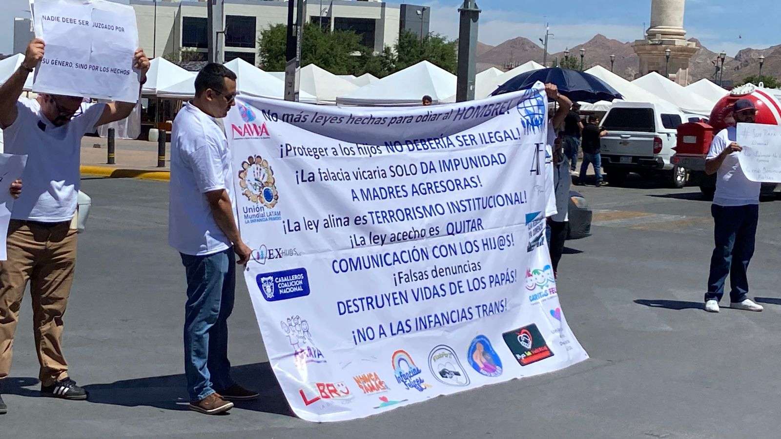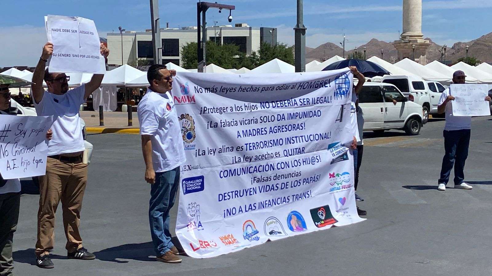 Con pancartas y lonas que decían "No más leyes hechas para odiar al hombre", "La falacia Vicaría solo da impunidad a madres agresoras", "La ley acecho es quitar comunicación con los y las hijas", cerraron las avenida Carranza y Aldama.