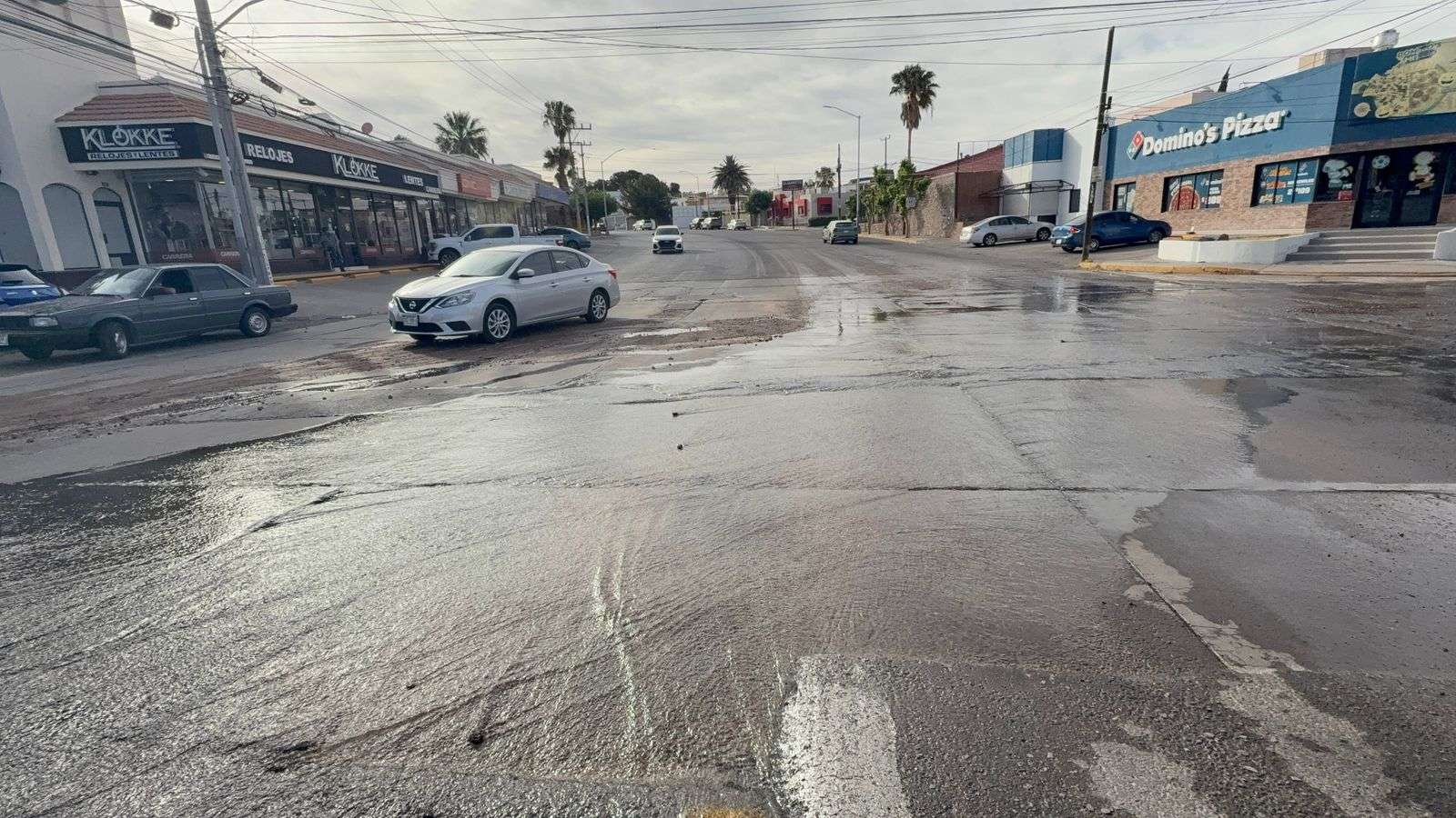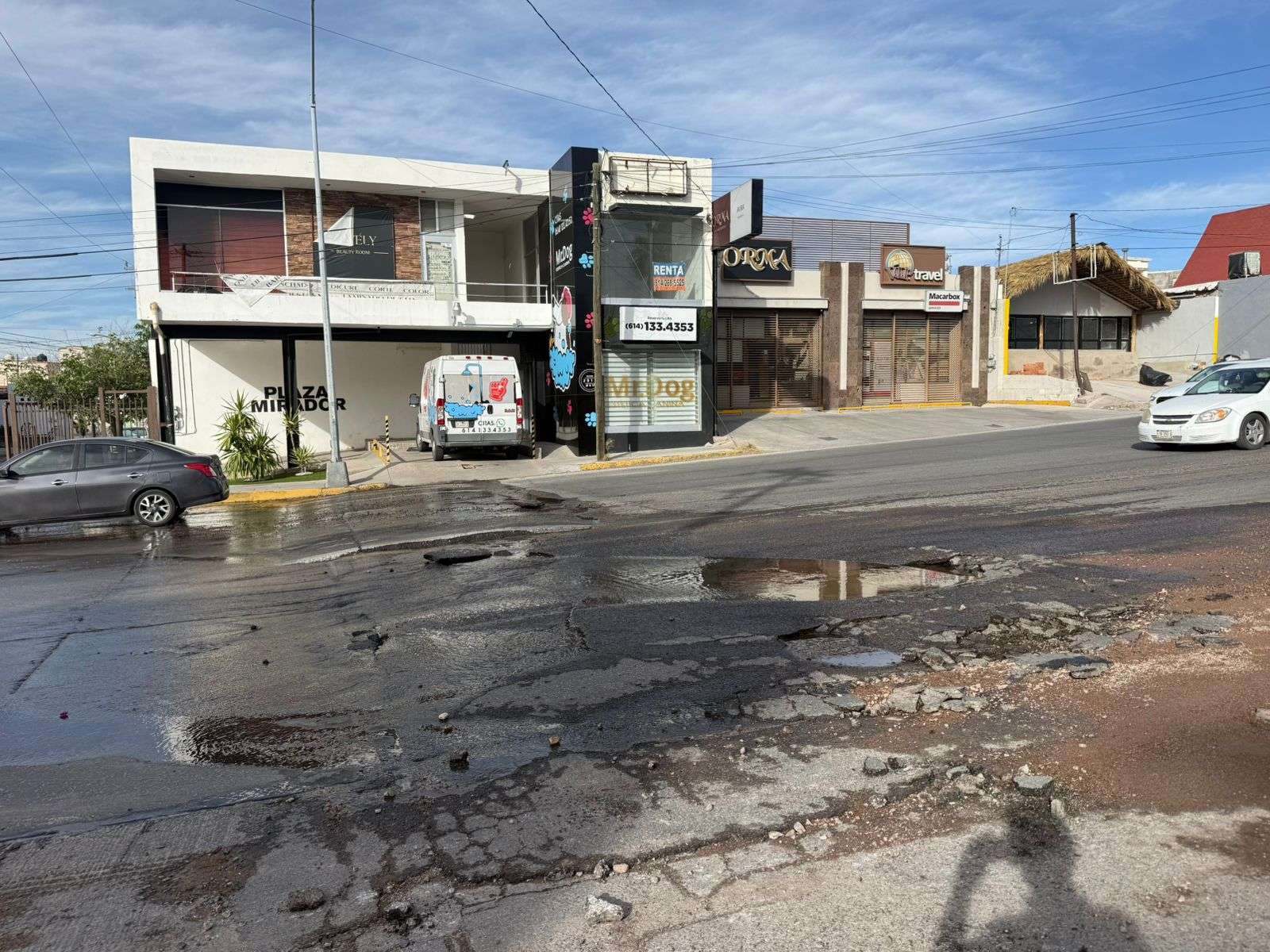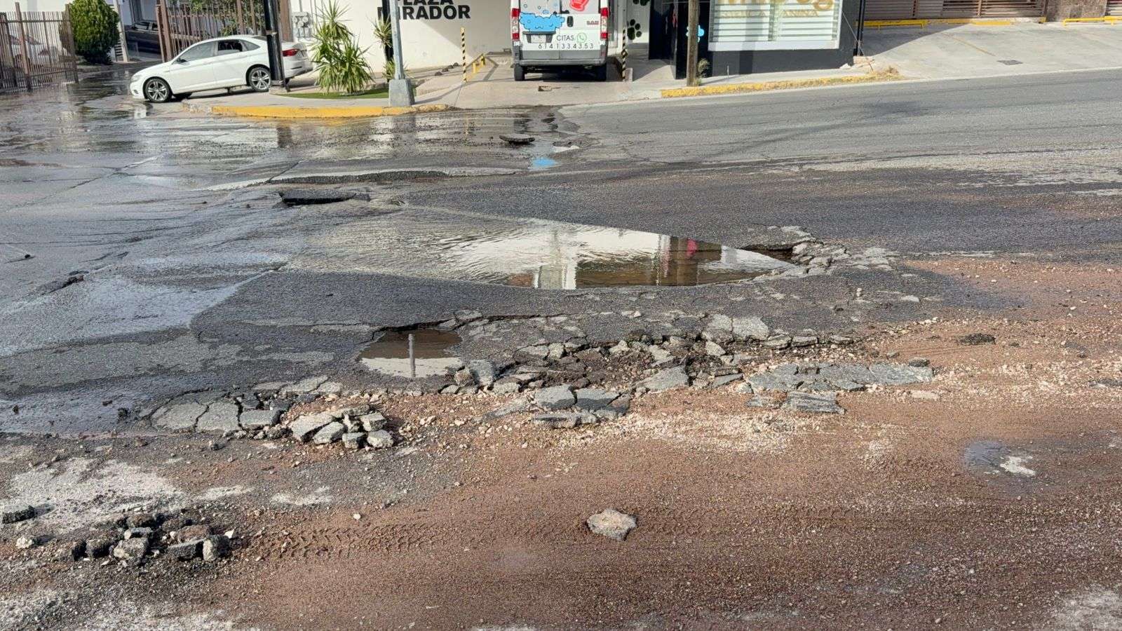 Chihuahua. - Una importante fuga de agua potable generó daños en la carpeta asfáltica y la movilización de personal técnico en el cruce de las calles Louisiana y Mirador. El incidente provocó el desprendimiento de pavimento, lo que obligó a restringir la circulación en la zona.
