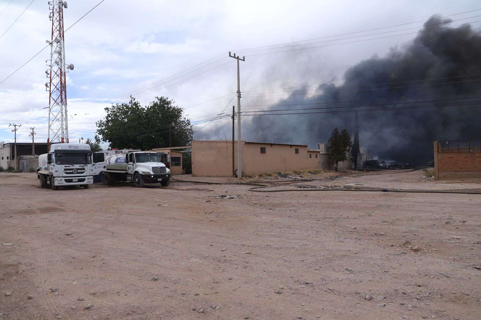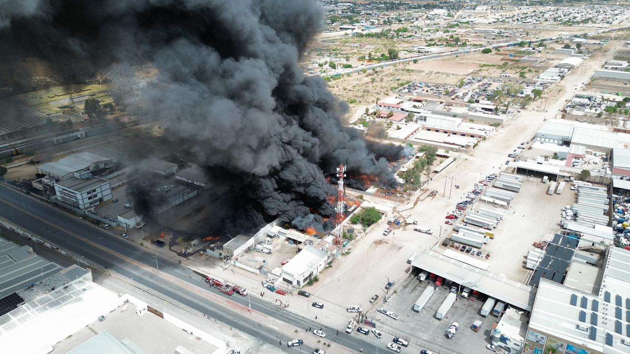Chihuahua, Chih.- La tarde de este domingo personal del H. Cuerpo de Bomberos se encuentra atendiendo y trabajando en la sofocacion total del incendio registrado en la empresa Procesadora y Recicladora de Materiales Industriales, ubicada en las calles Sierra de la Cal y calle 57, en la colonia Primero de Mayo, donde se almacenaban cerca de 160 toneladas de plástico.