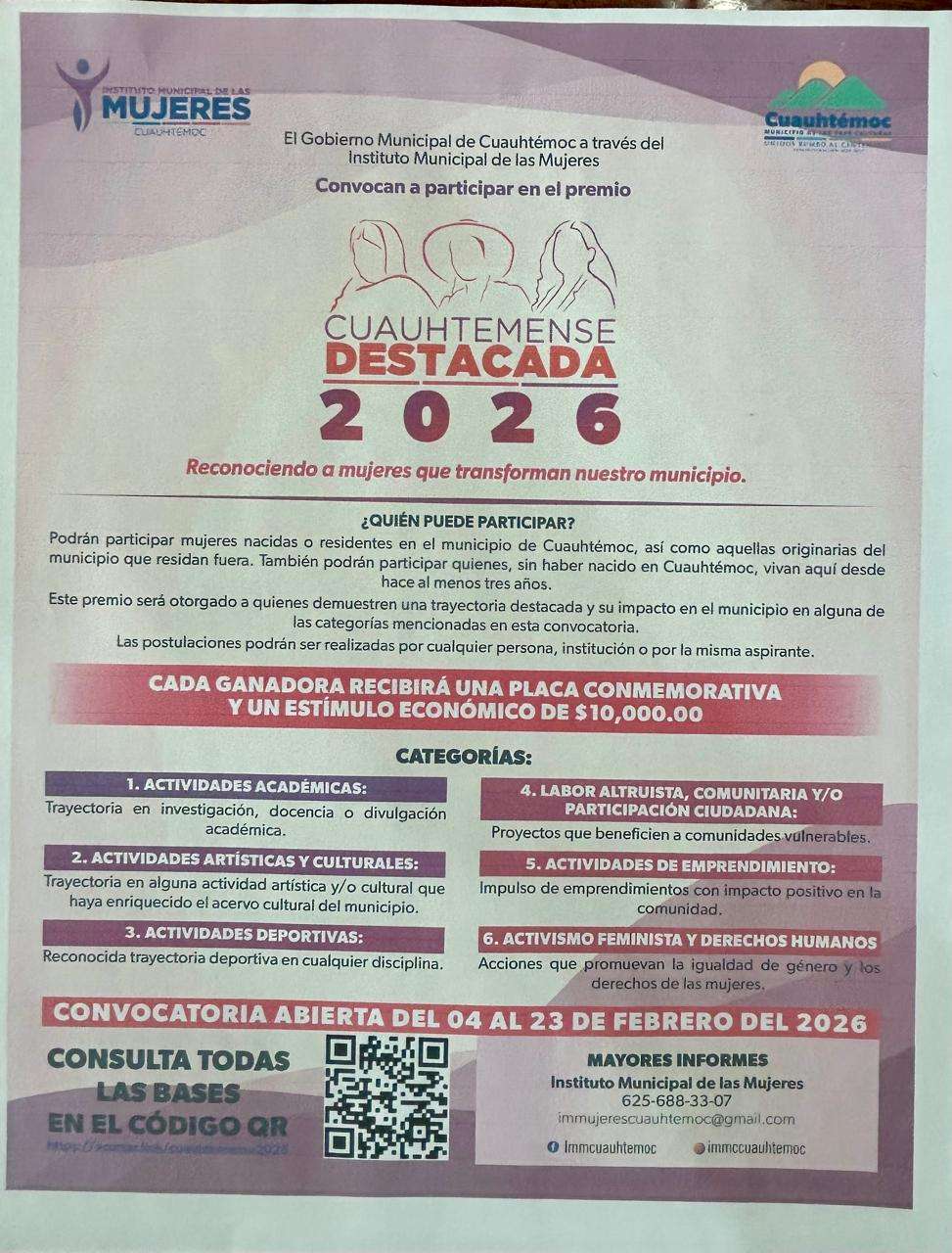 La fecha límite para la recepción de candidaturas es el próximo 23 de febrero. Las bases completas pueden consultarse en las redes sociales del Instituto Municipal de las Mujeres. Finalmente, la directora subrayó que esta iniciativa, que cuenta con el respaldo del Gobierno Municipal y el apoyo del diputado Saúl Mireles, tiene como objetivo principal impulsar las carreras de las mujeres y celebrar públicamente su esfuerzo y dedicación.