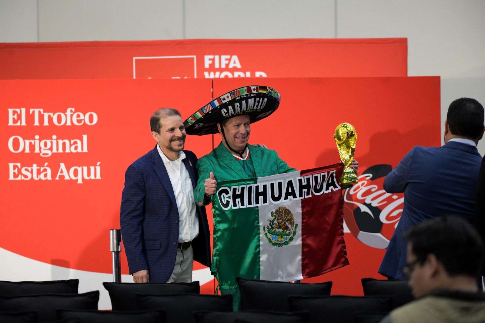Chihuahua, Chih.- La gobernadora Maru Campos en conjunto con Arca Continental y Coca-Cola México dio la bienvenida a la capital del estado al Trofeo de la Copa Mundial de la FIFA 2026, presentado por Coca-Cola en ceremonia realizada en el Centro de Convenciones Expo Chihuahua.