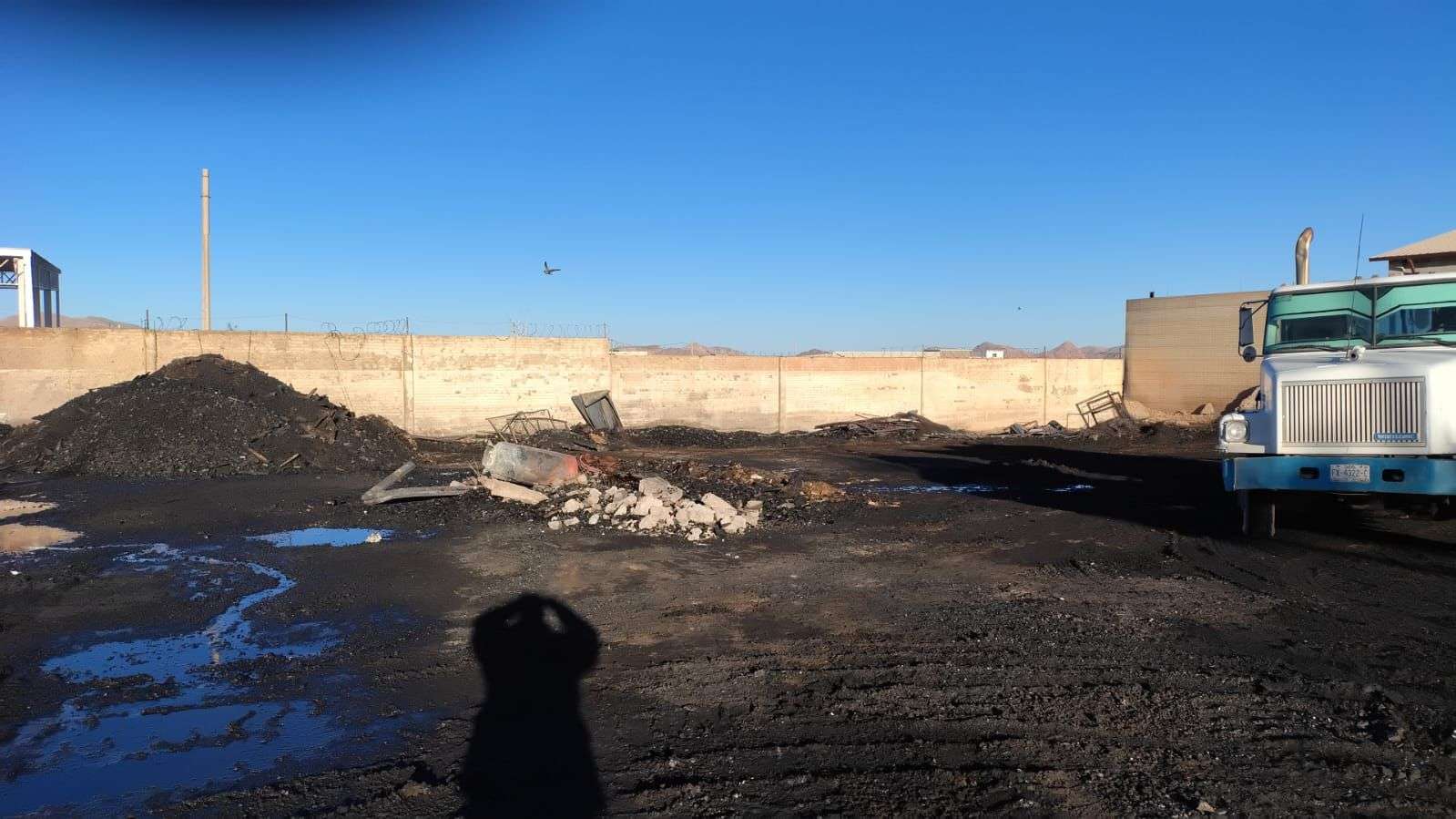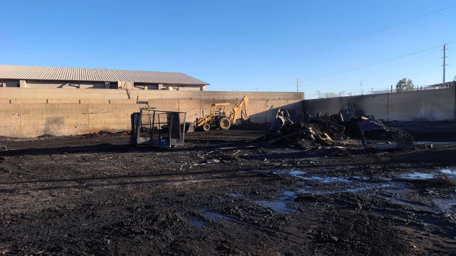 Chihuahua. - Elementos del H. Cuerpo de Bomberos, realizaron labores de remoción y retiro de material al interior de una tarimera, donde la noche del viernes se registró un incendio al norte de la ciudad.