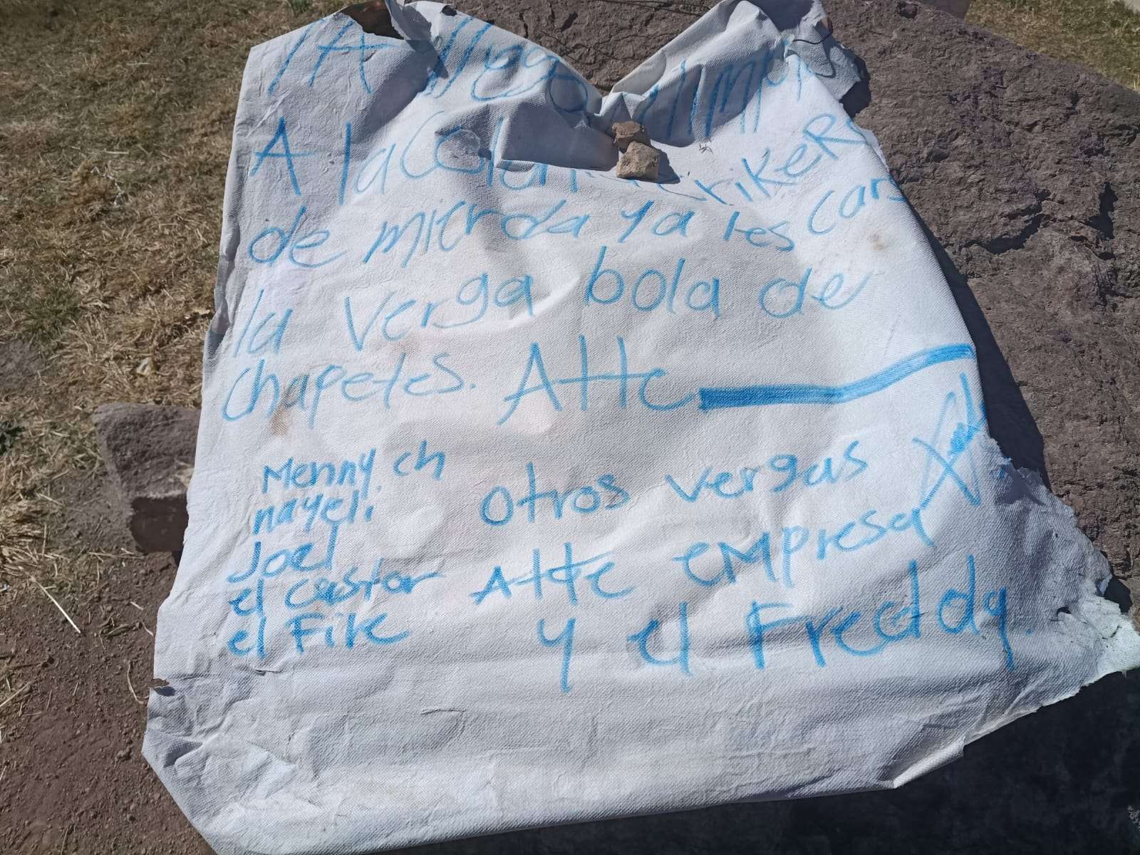 Al número de emergencia se informó sobre el hallazgo, por lo que primero acudieron elementos de la Policía Municipal y, posteriormente, de la Policía Estatal, quienes aseguraron la lona que contenía amenazas, el mensaje que contenía decía: