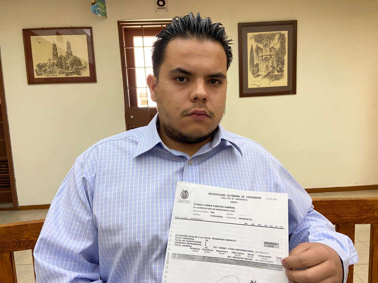 Chihuahua.- Gabriel Lomas, estudiante de quinto semestre de Ingeniería Civil en la Facultad de Ingeniería de la UACH, denunció que ha enfrentado obstáculos para registrarse como candidato a consejero universitario, a pesar de cumplir con todos los requisitos establecidos en la convocatoria oficial. Según su versión, ha sido bloqueado por autoridades estudiantiles.