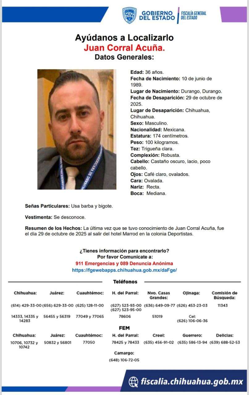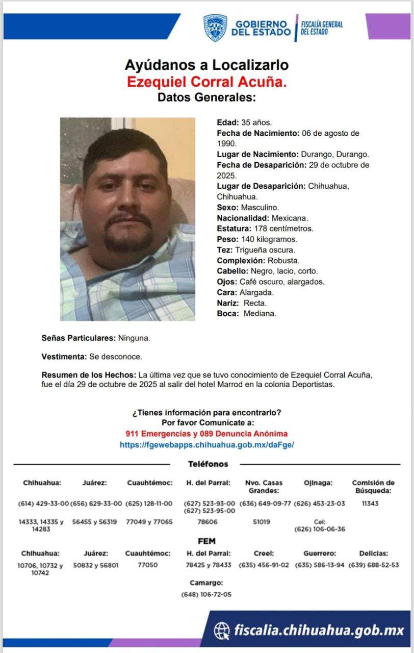 Chihuahua, Chih. – Tres hombres originarios de Durango desaparecieron luego de salir del Hotel Marrod, informó la Fiscalía del Estado.