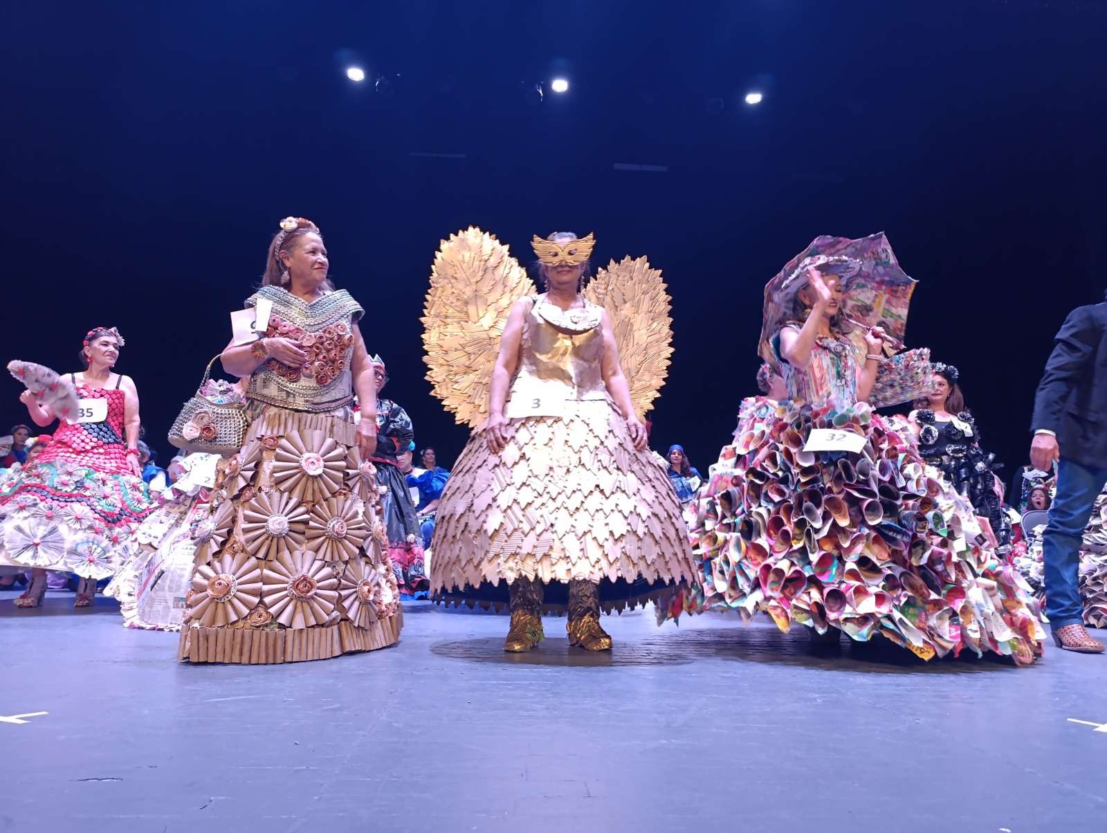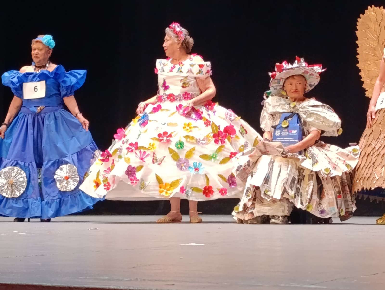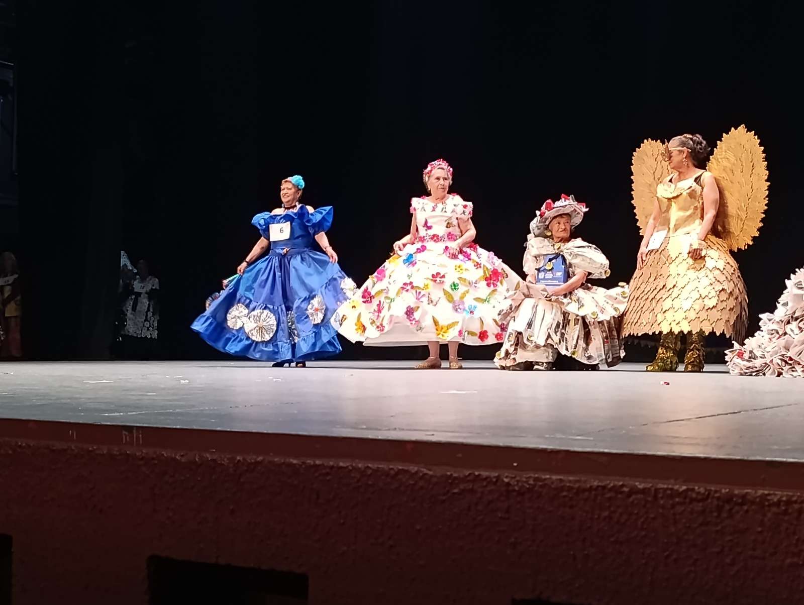 El Teatro de la Ciudad se llenó de aplausos mientras las participantes desfilaron con prendas elaboradas a partir de materiales reciclados. Con paso firme, entusiasmo y un inigualable carisma, las abuelitas modelaron diseños creados con cartón, plástico, papel y otros materiales recuperados, demostrando que el reciclaje también puede convertirse en arte, moda y expresión personal.