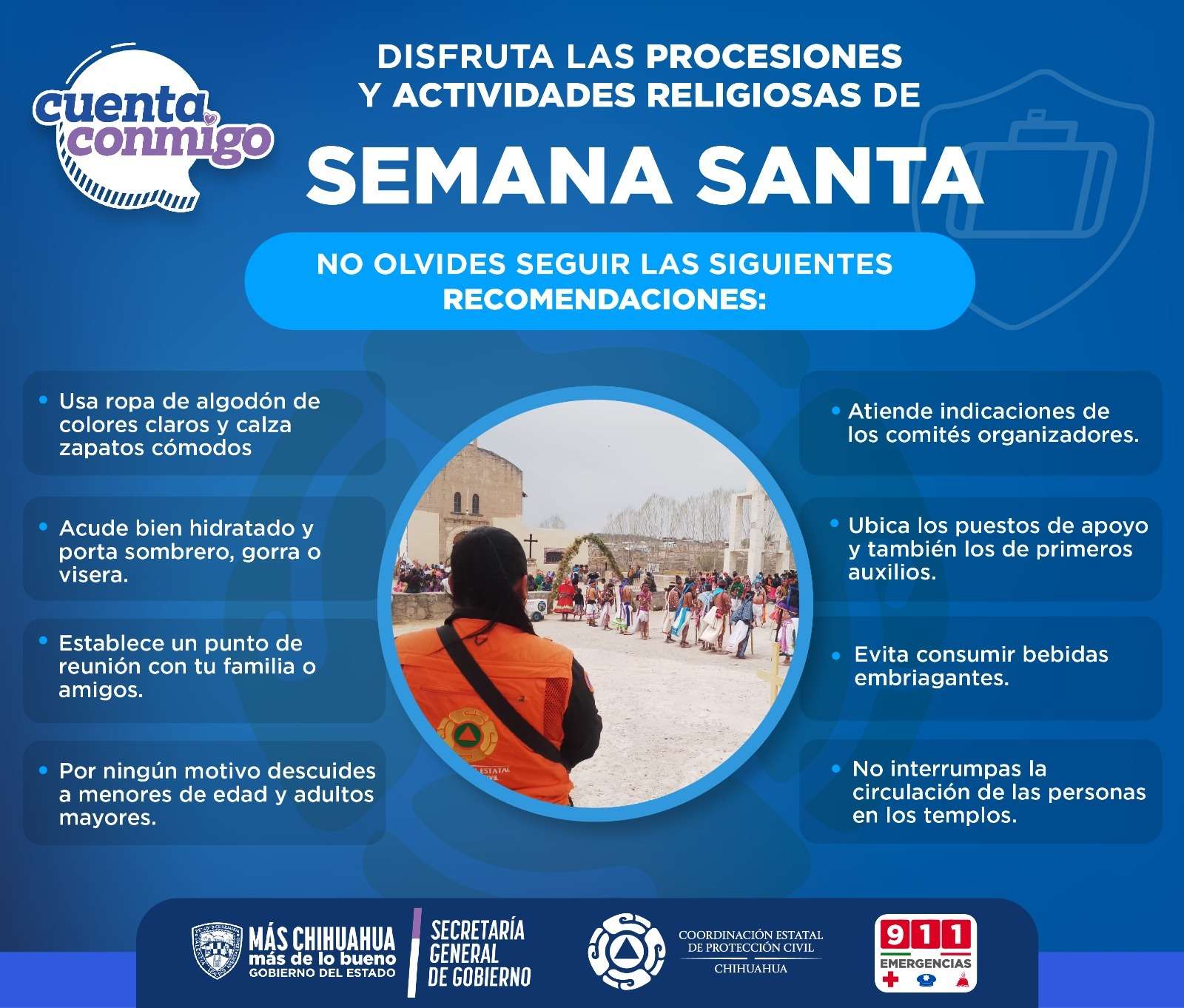 Chihuahua. - La Coordinación Estatal de Protección Civil (CEPC) emitió una serie de recomendaciones ante la realización de actos litúrgicos, procesiones y representaciones del Viacrucis en diversos puntos de la entidad, con el fin de prevenir incidentes y garantizar la seguridad de la población.