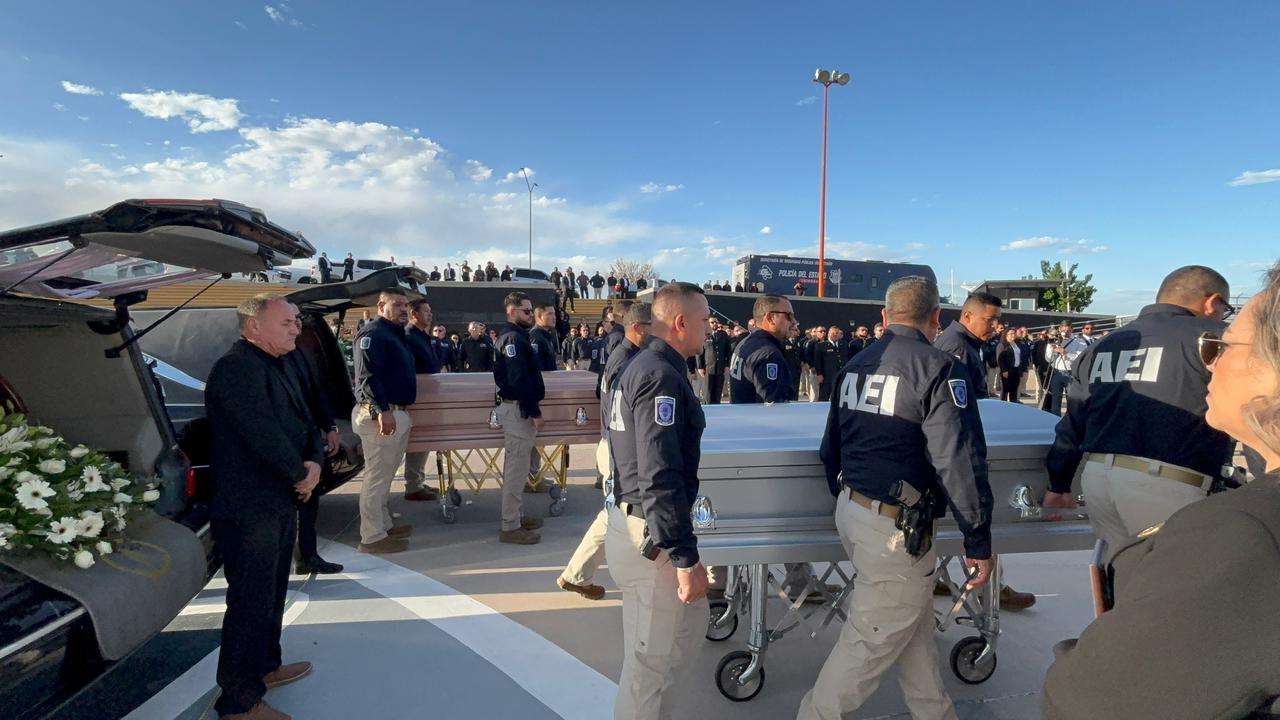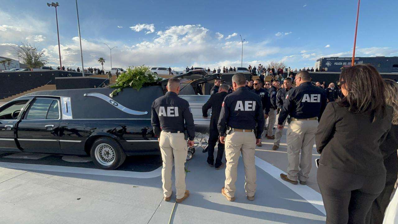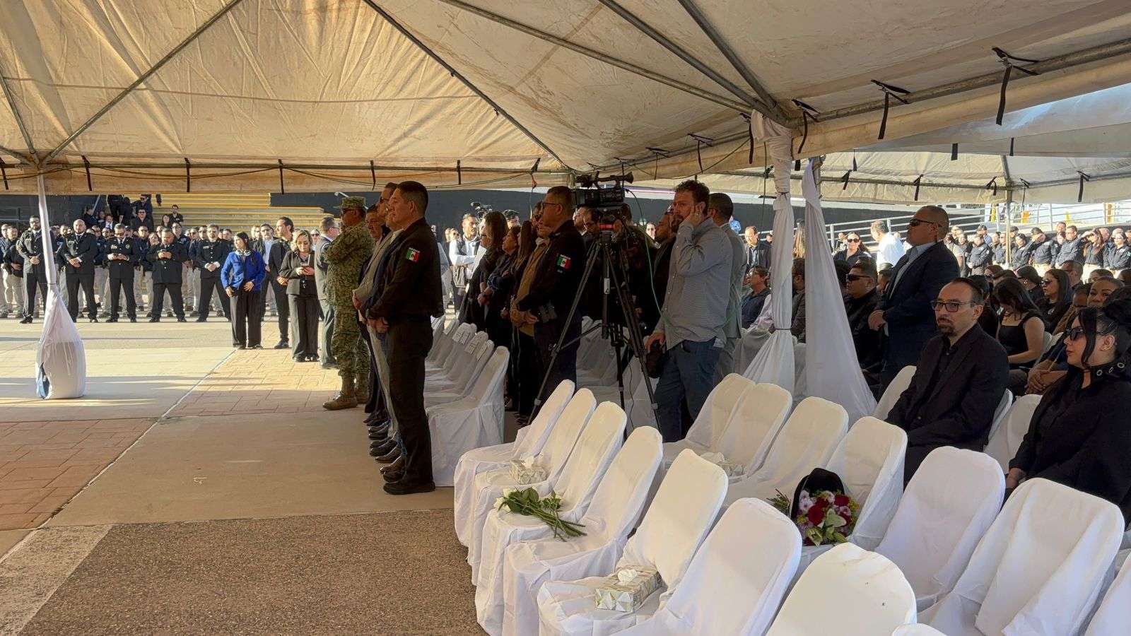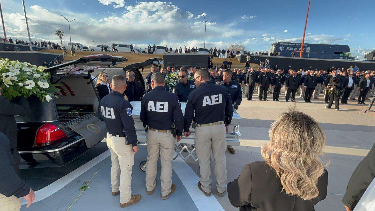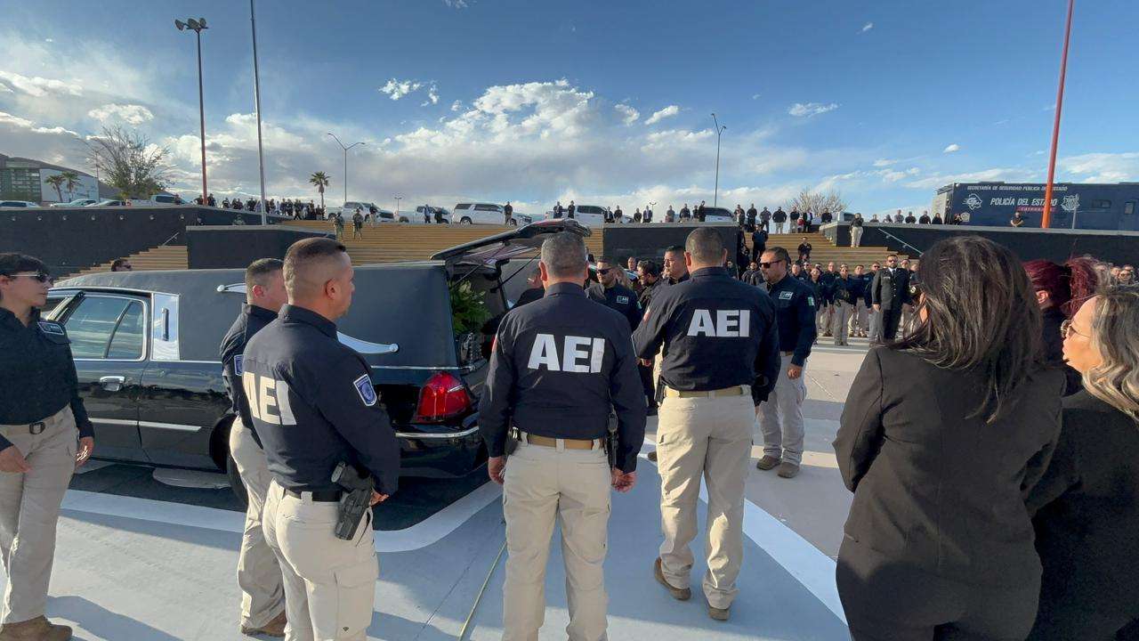 Chihuahua.- La tarde de este lunes, la gobernadora Maru Campos, acompañada por el fiscal general César Jáuregui y el alcalde capitalino Marco Antonio Bonilla Mendoza, encabezó la ceremonia de honras fúnebres en memoria de Pedro Román Oseguera Cervantes, director de la Agencia Estatal de Investigación (AEI), y del oficial Manuel Genaro Méndez Montes.