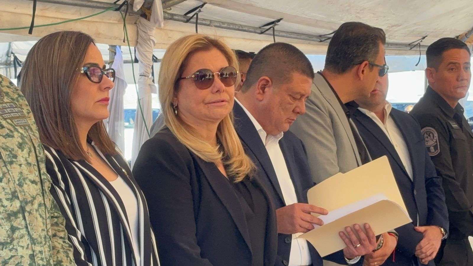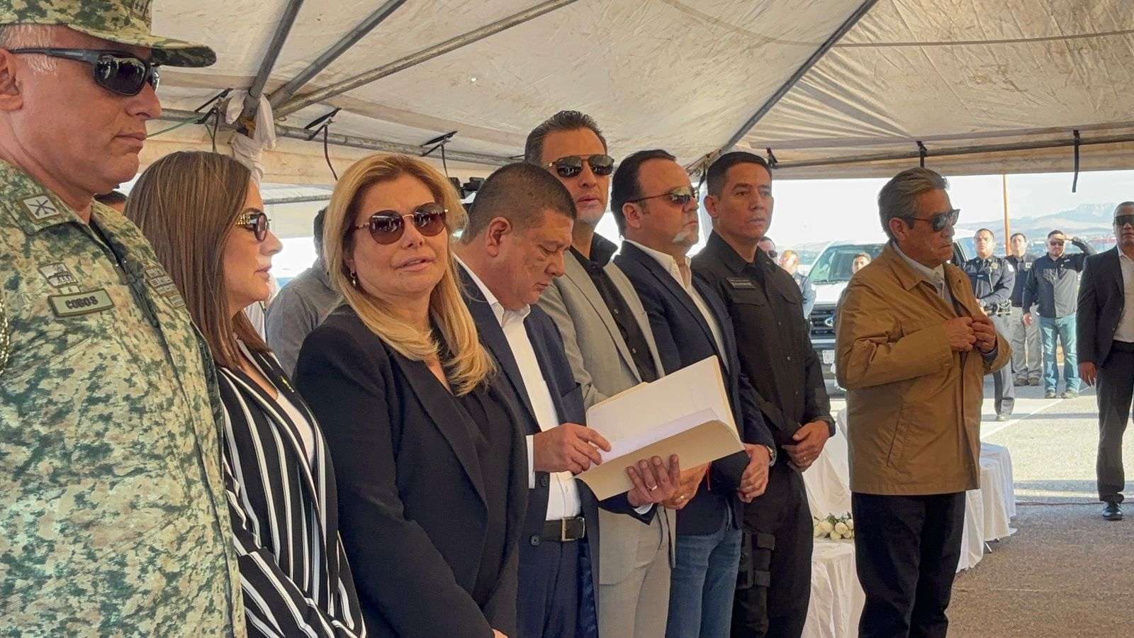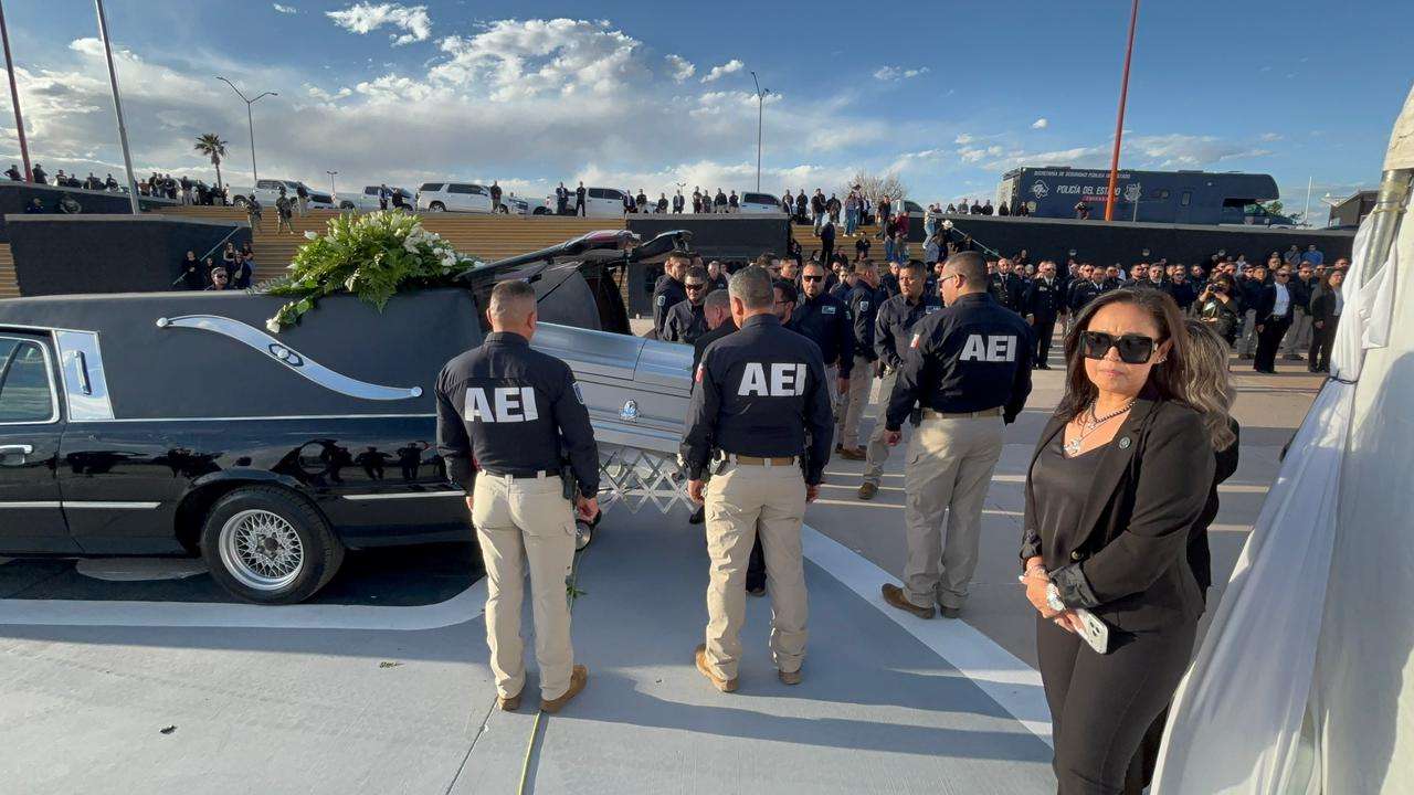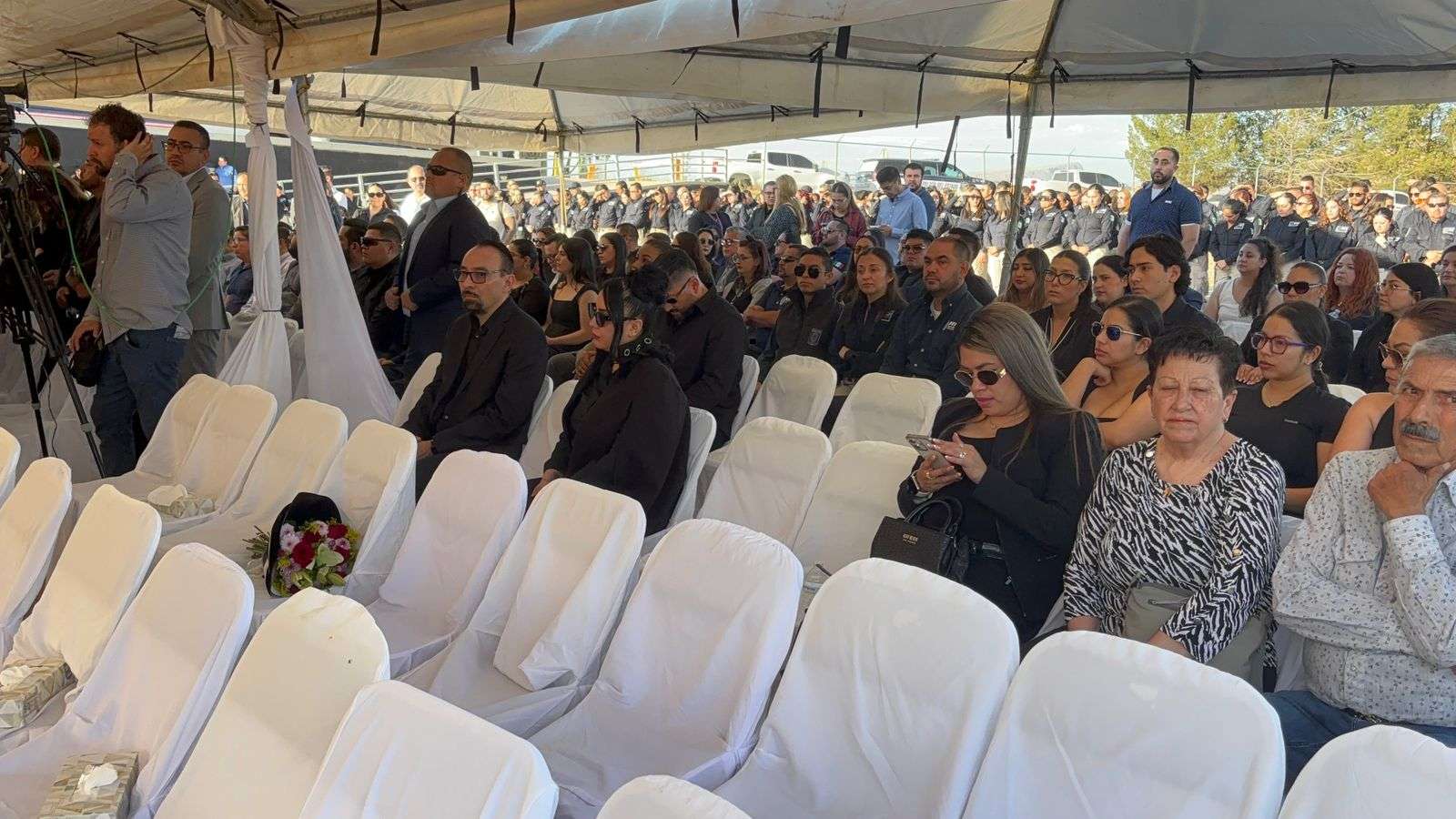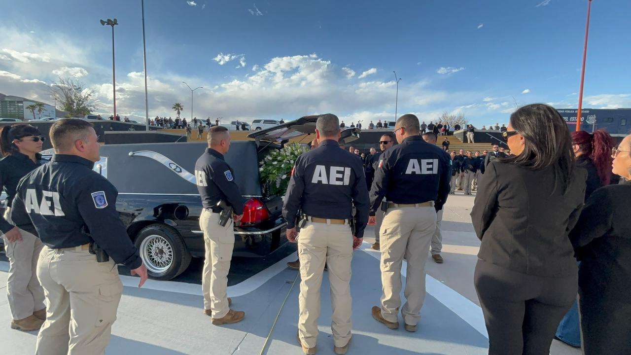 Chihuahua.- La tarde de este lunes, la gobernadora Maru Campos, acompañada por el fiscal general César Jáuregui y el alcalde capitalino Marco Antonio Bonilla Mendoza, encabezó la ceremonia de honras fúnebres en memoria de Pedro Román Oseguera Cervantes, director de la Agencia Estatal de Investigación (AEI), y del oficial Manuel Genaro Méndez Montes.
