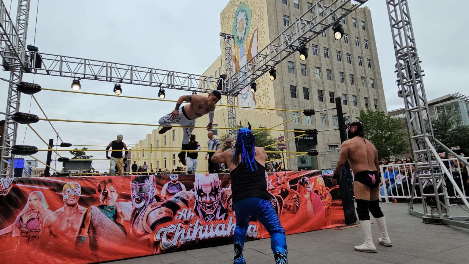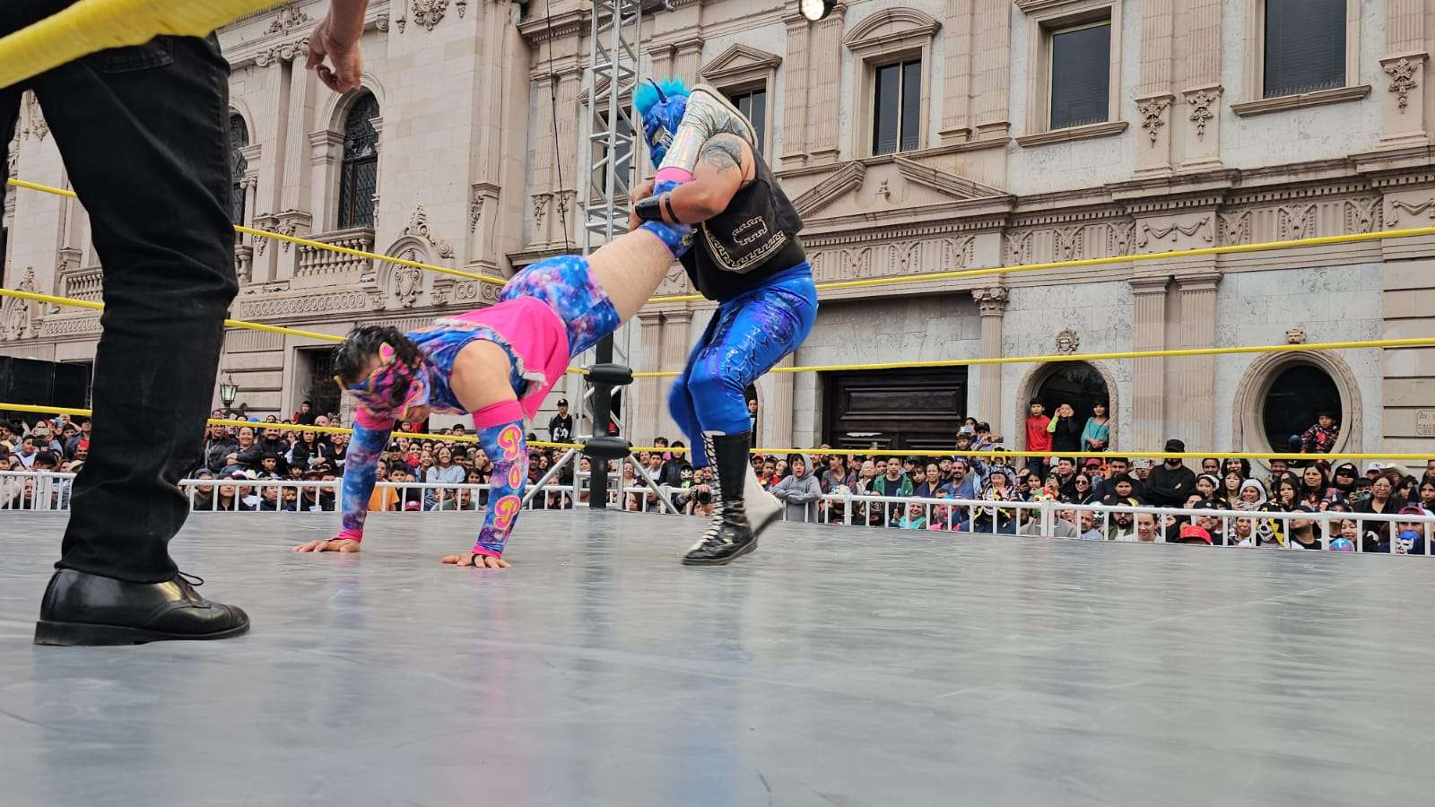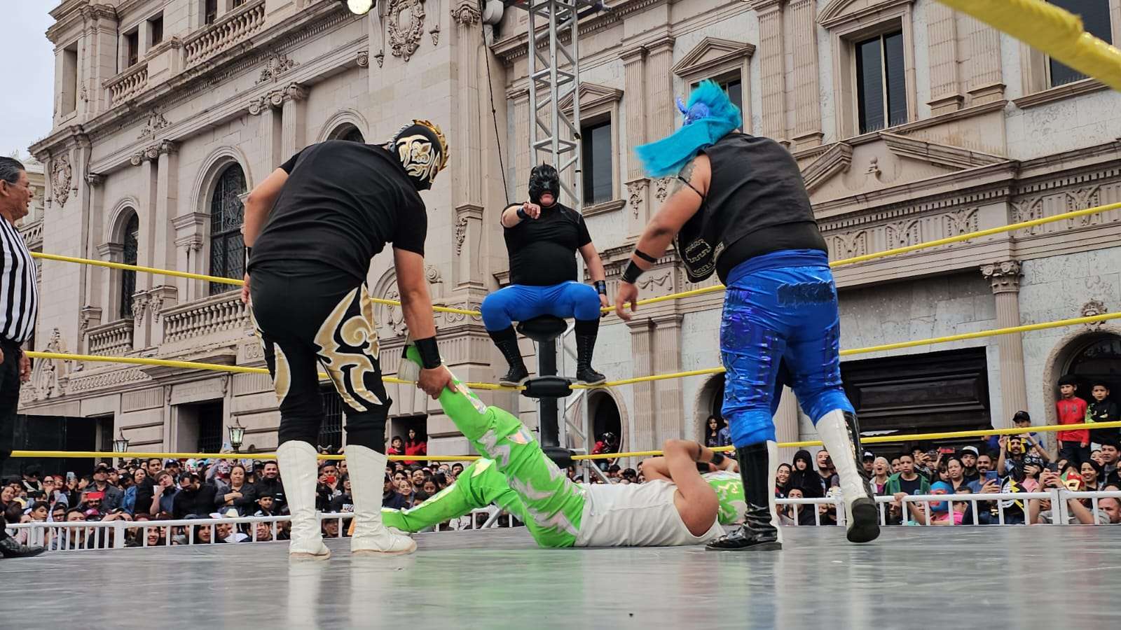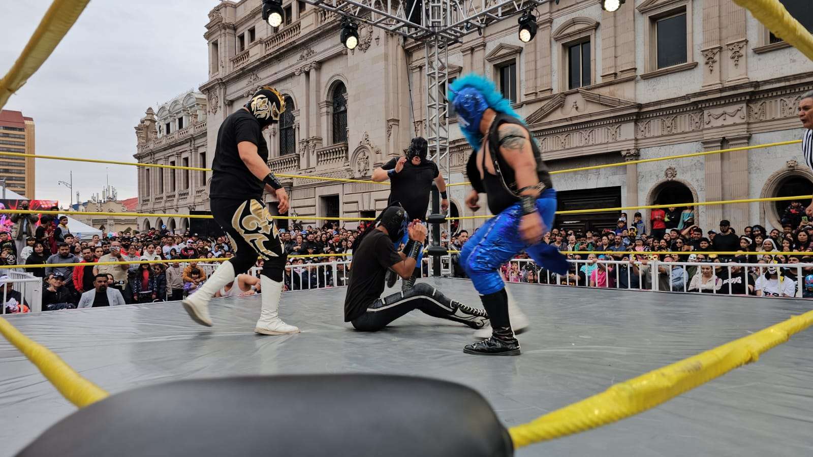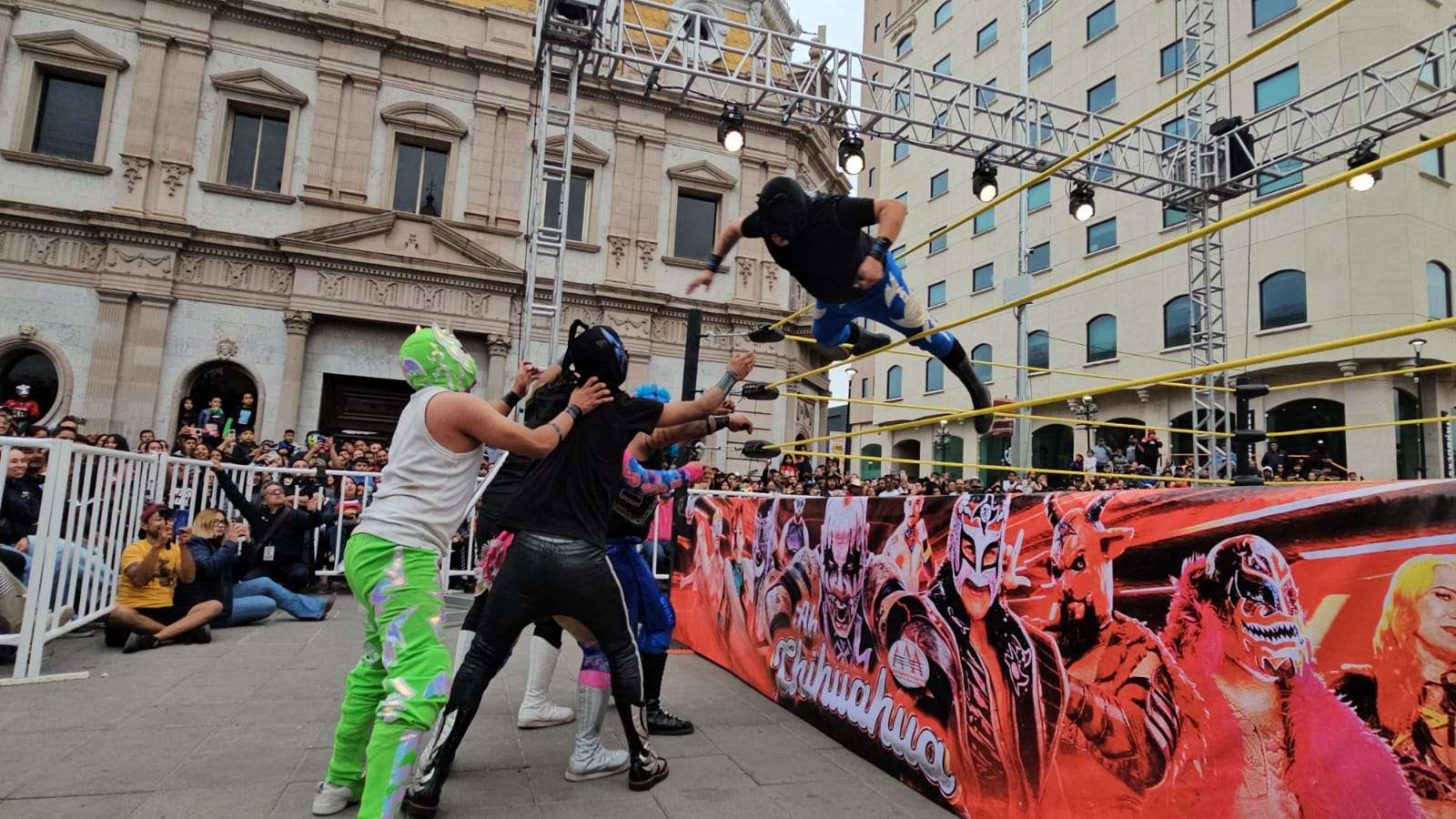 Chihuahua.- La pasión de la lucha libre mexicana se apoderó por completo de la Plaza de Armas este domingo, donde rudos y técnicos contendieron en una caída sin límites de tiempo que mantuvo al filo del asiento a cientos de familias chihuahuenses.