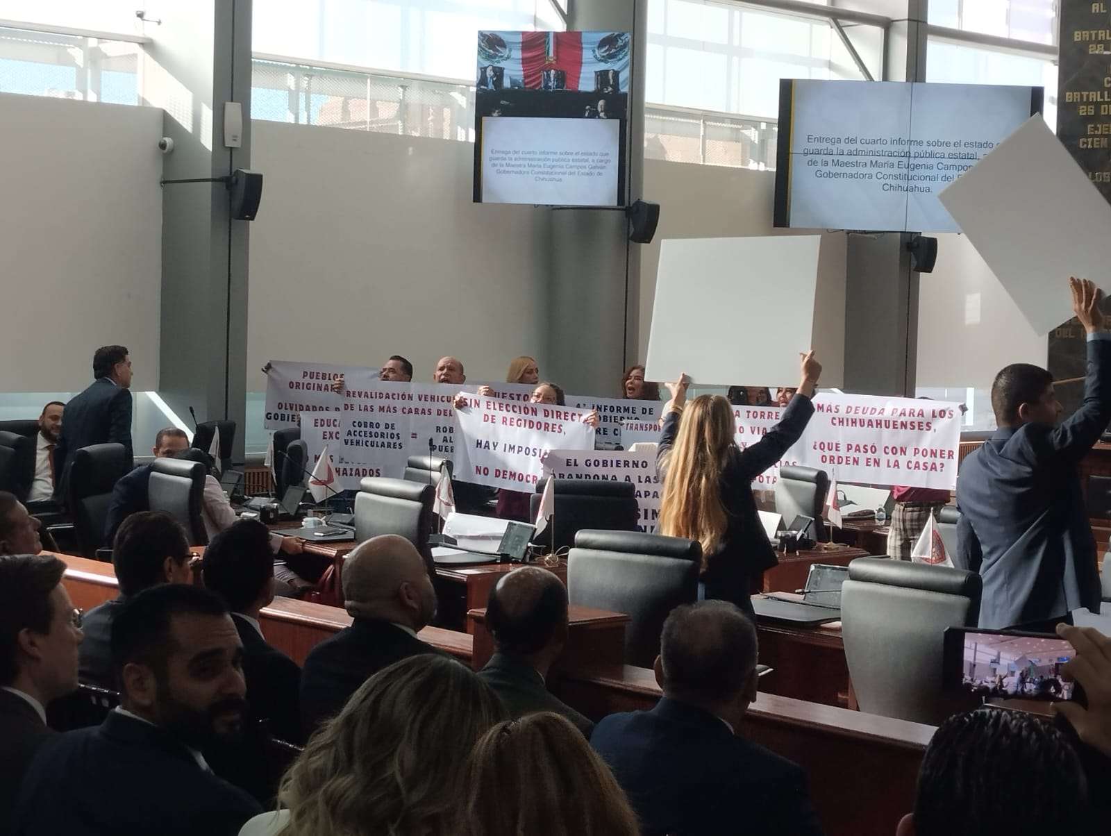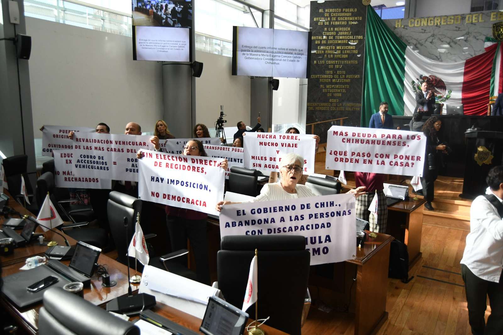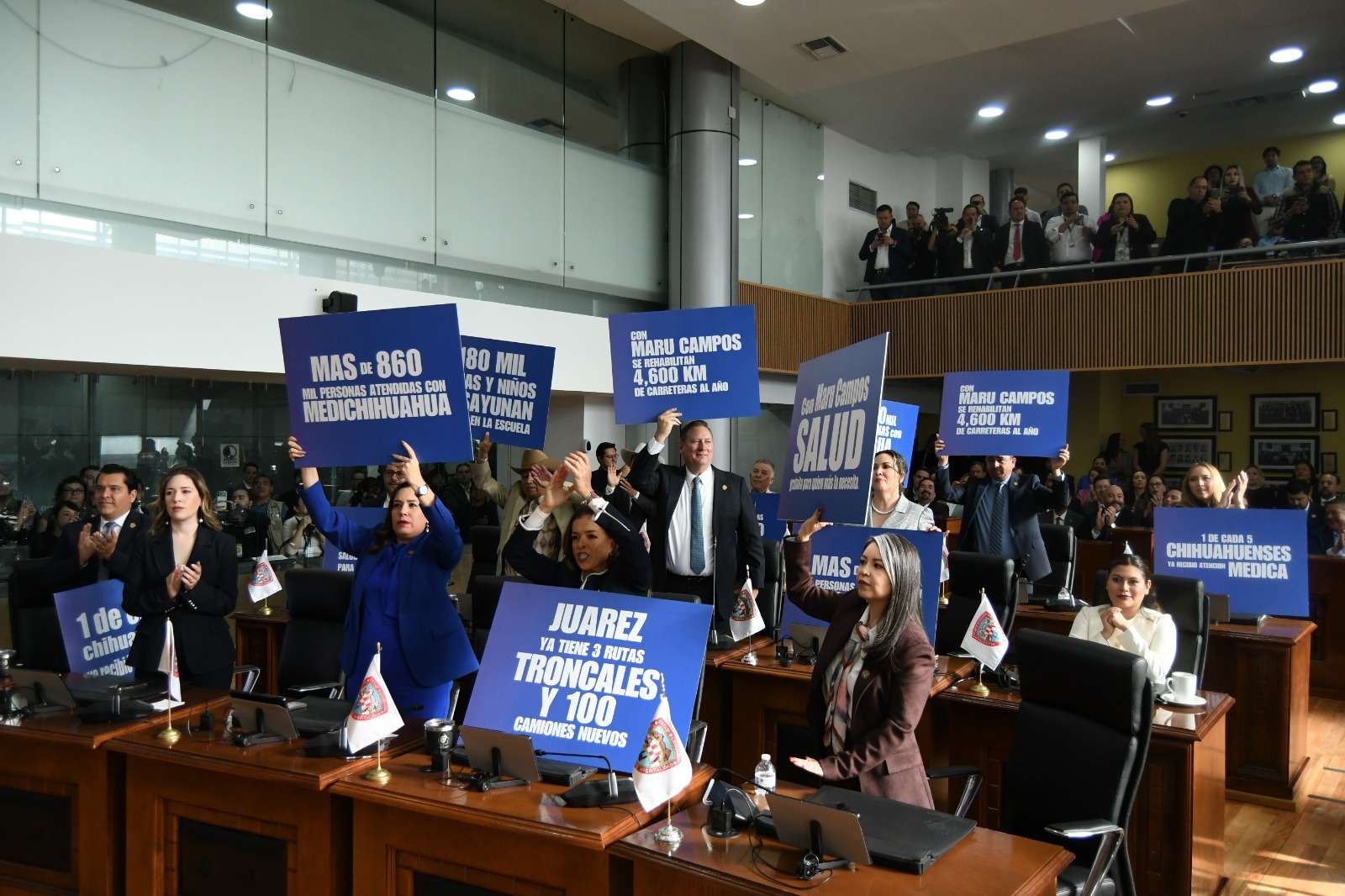 Chihuahua. - Esta mañana, durante la entrega de la glosa realizada por el secretario general, Santiago de la Peña, en representación de la gobernadora Maru Campos, diputados locales de Morena se pronunciaron en contra del desempeño de los cargos de los funcionarios públicos.