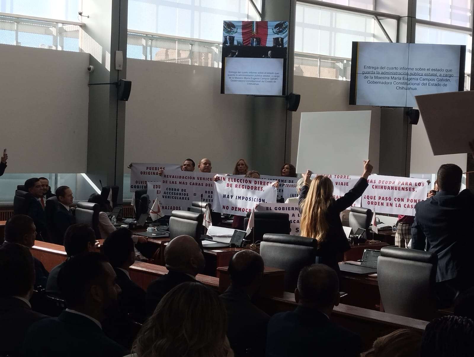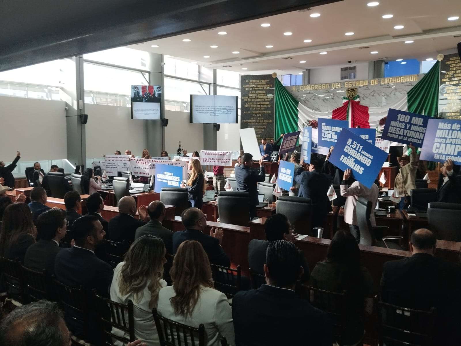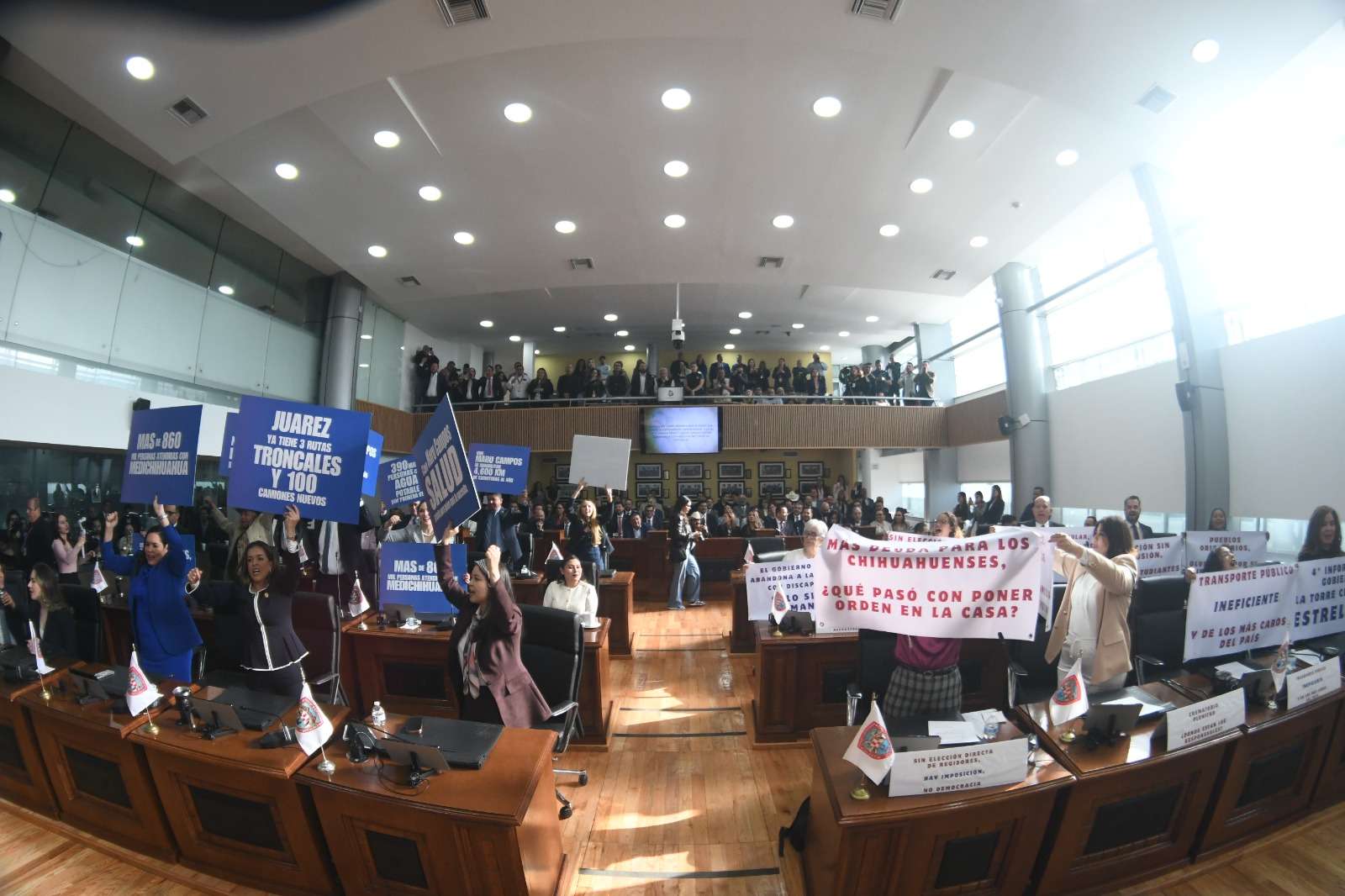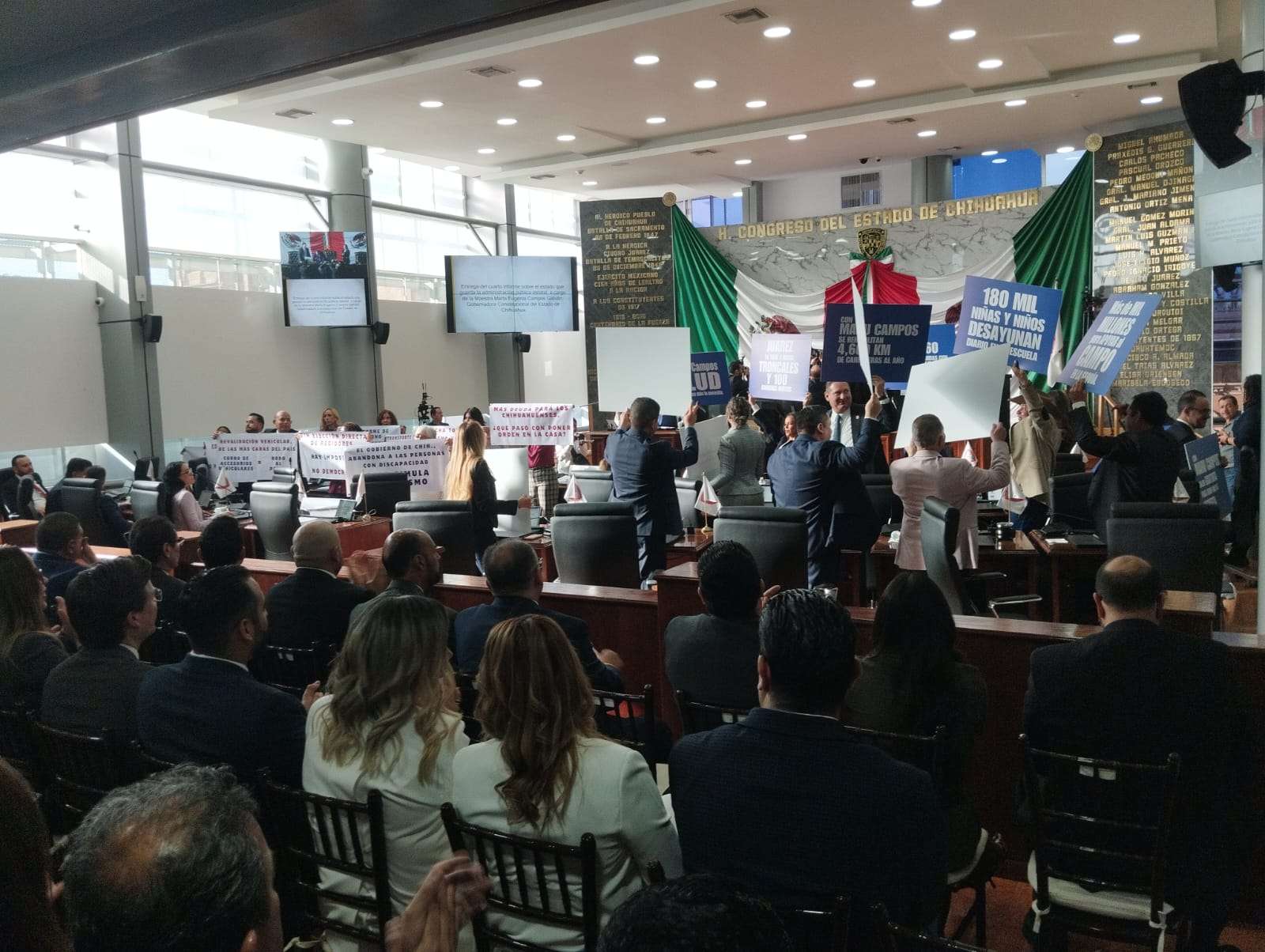 Chihuahua. - Esta mañana, durante la entrega de la glosa realizada por el secretario general, Santiago de la Peña, en representación de la gobernadora Maru Campos, diputados locales de Morena se pronunciaron en contra del desempeño de los cargos de los funcionarios públicos.