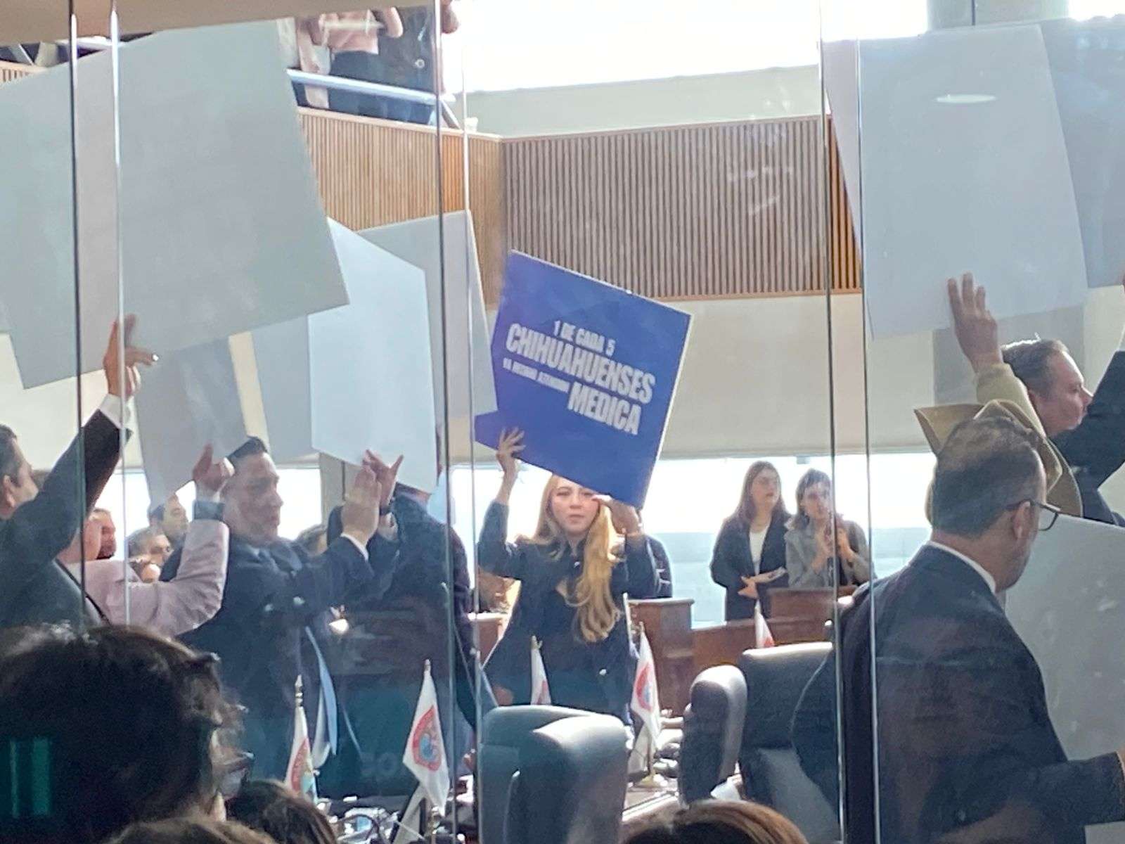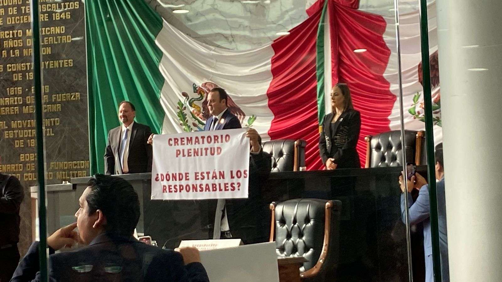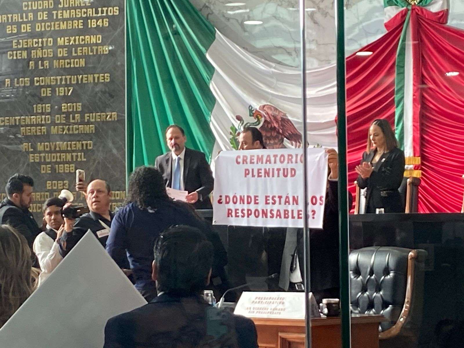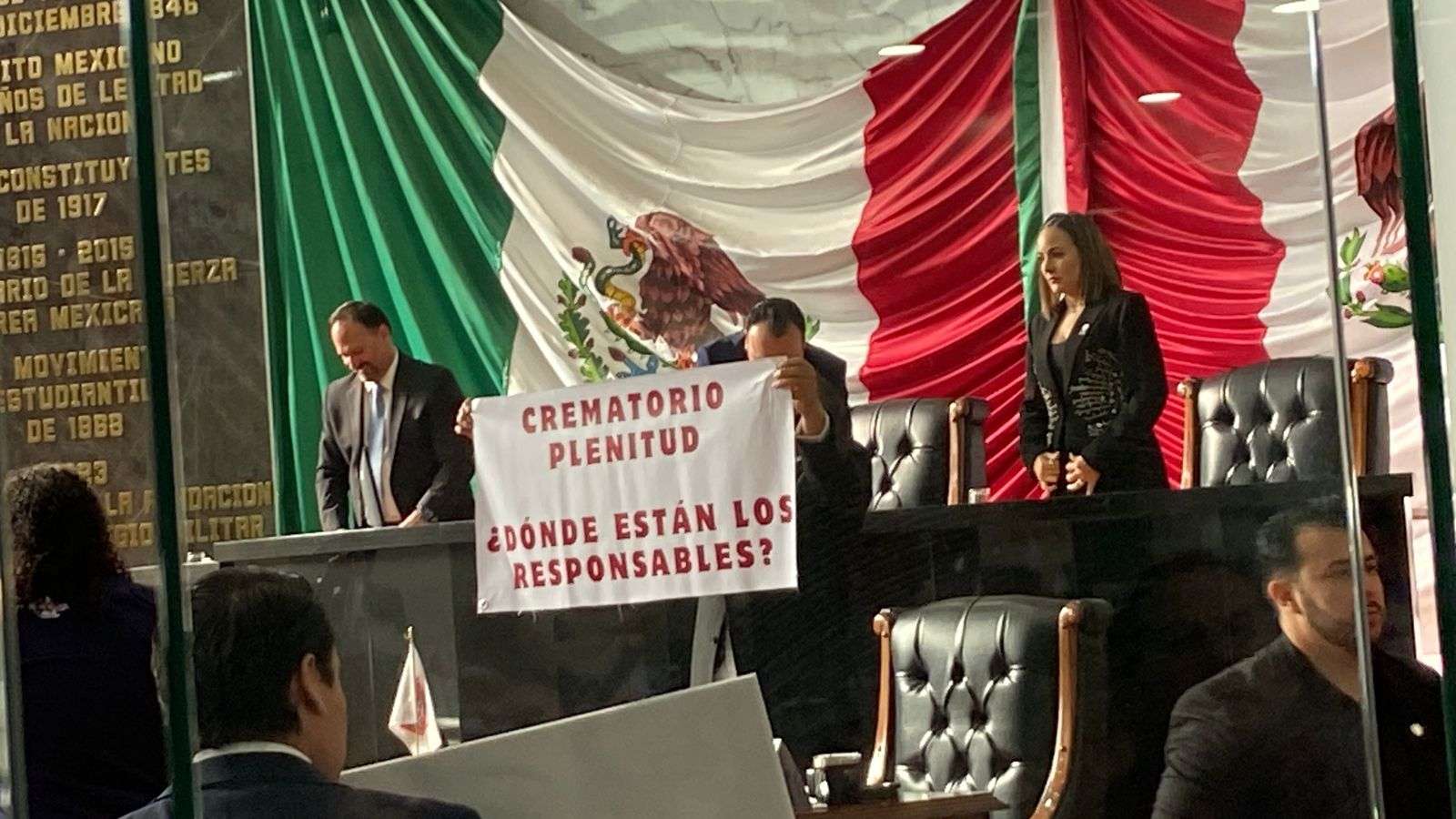 Durante el acto de entrega diputados del PAN como de Morena se manifestaron con pancartas, los de Morena exigiendo justicia para las familias del crematorio Plenitud y los del PAN, en apoyo a la Gobernadora Maru Campos.