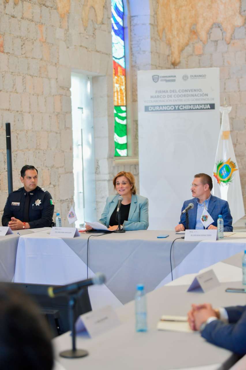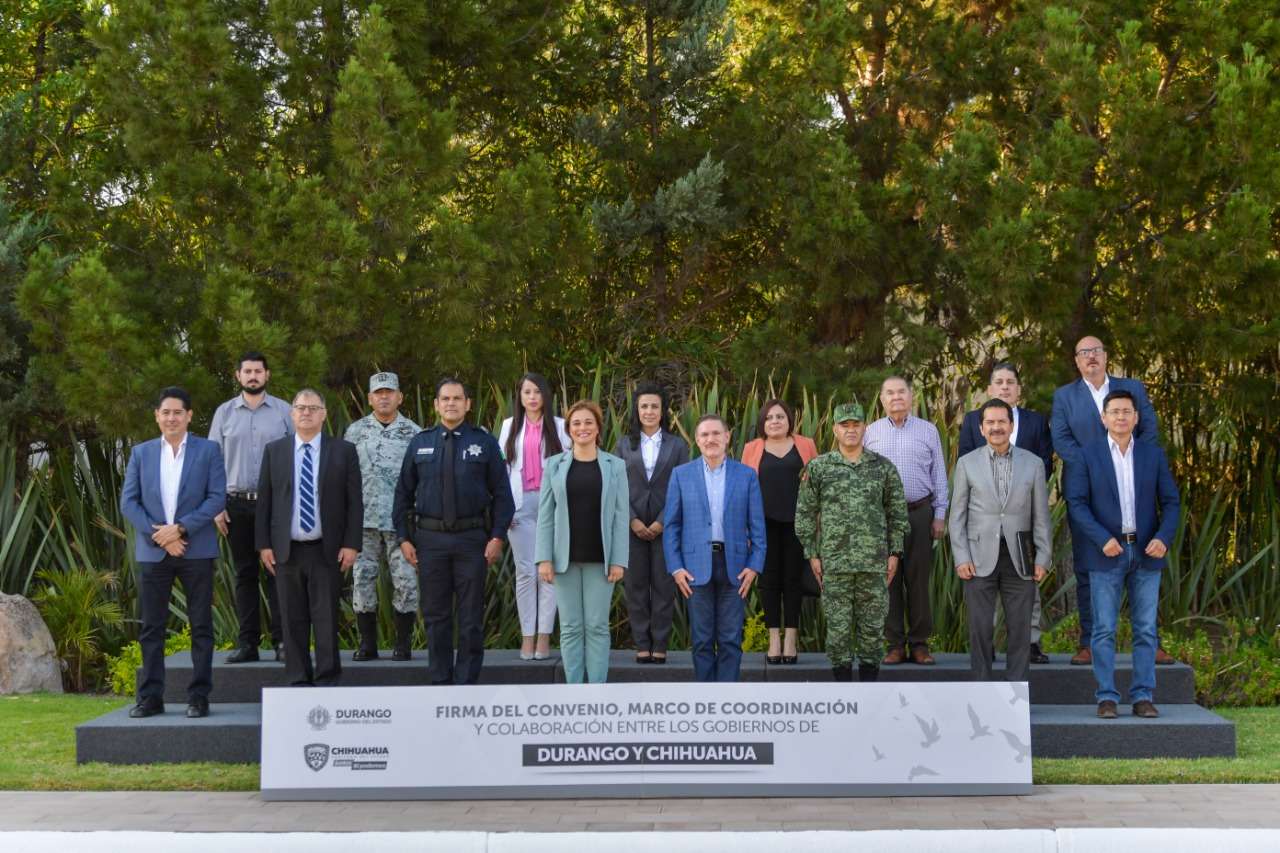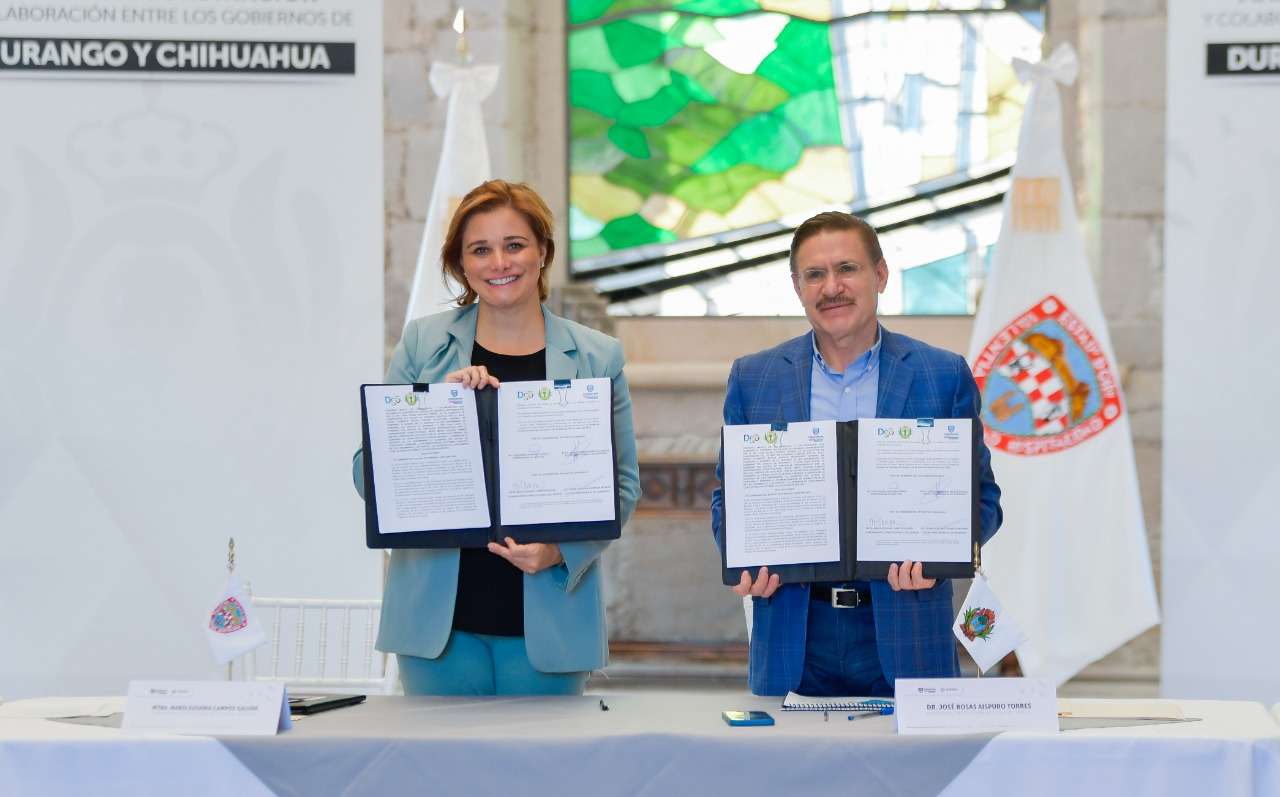 Chihuahua.- La gobernadora Maru Campos Galván y su homólogo del Estado de Durango, José Rosas Aispuro, firmaron un Convenio Marco de Coordinación y Colaboración en materia de Seguridad Pública, para realizar acciones enfocadas en salvaguardar la vida, las libertades, la integridad y el patrimonio de la población de ambas entidades.