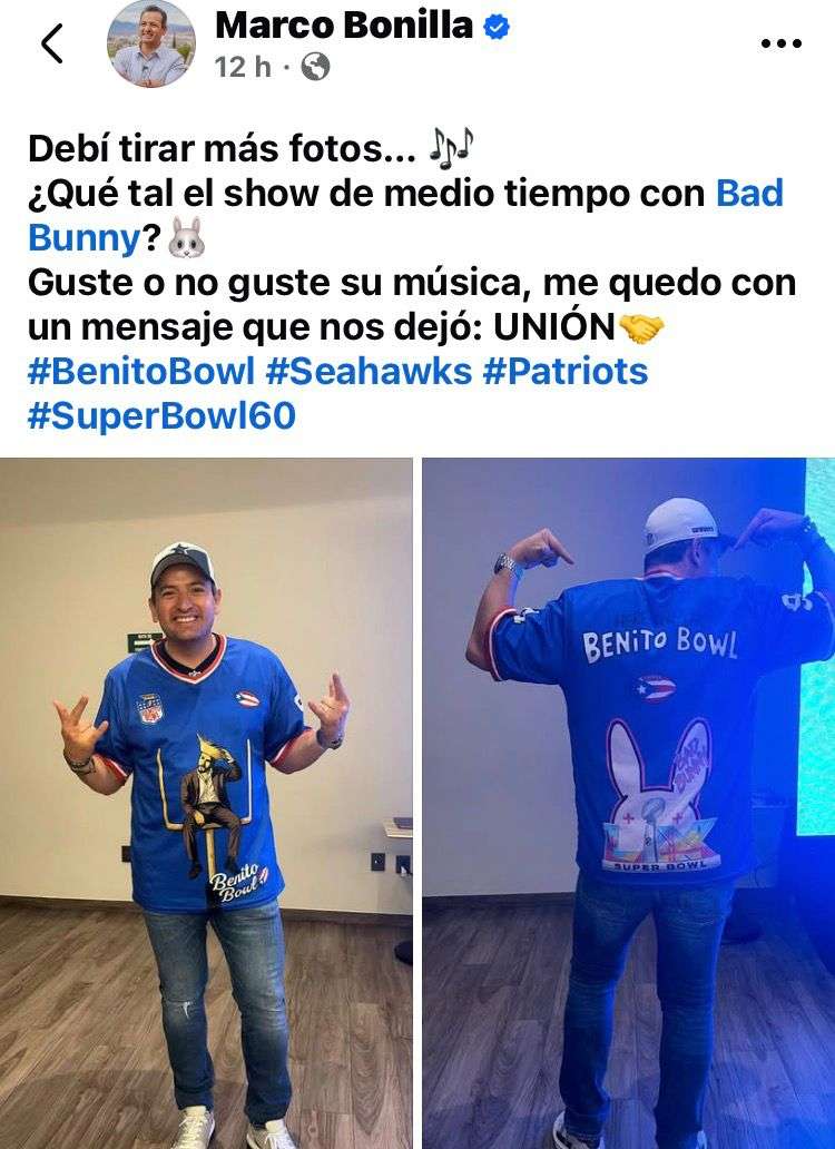 Con estas fotografías, Bonilla se unió a la expectativa que ha generado el Super Bowl LX, destacando que el mensaje de unión que transmite el espectáculo de medio tiempo es lo que realmente debe prevalecer entre los aficionados y la ciudadanía.