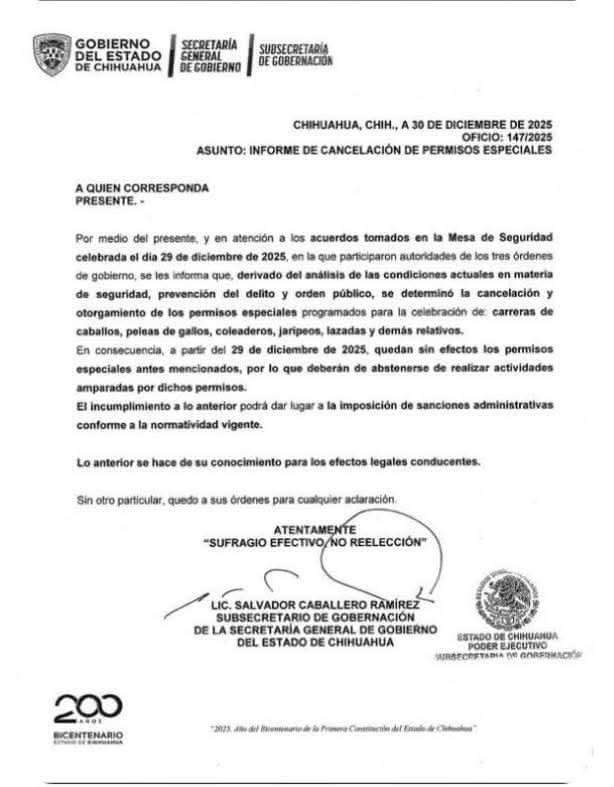 La cancelación de los eventos fue un acuerdo que se tomó en la mesa de seguridad, al menos así lo indica el oficio SG/147/2025, firmado por el subsecretario de Gobernación, Salvador Caballero Ramírez.