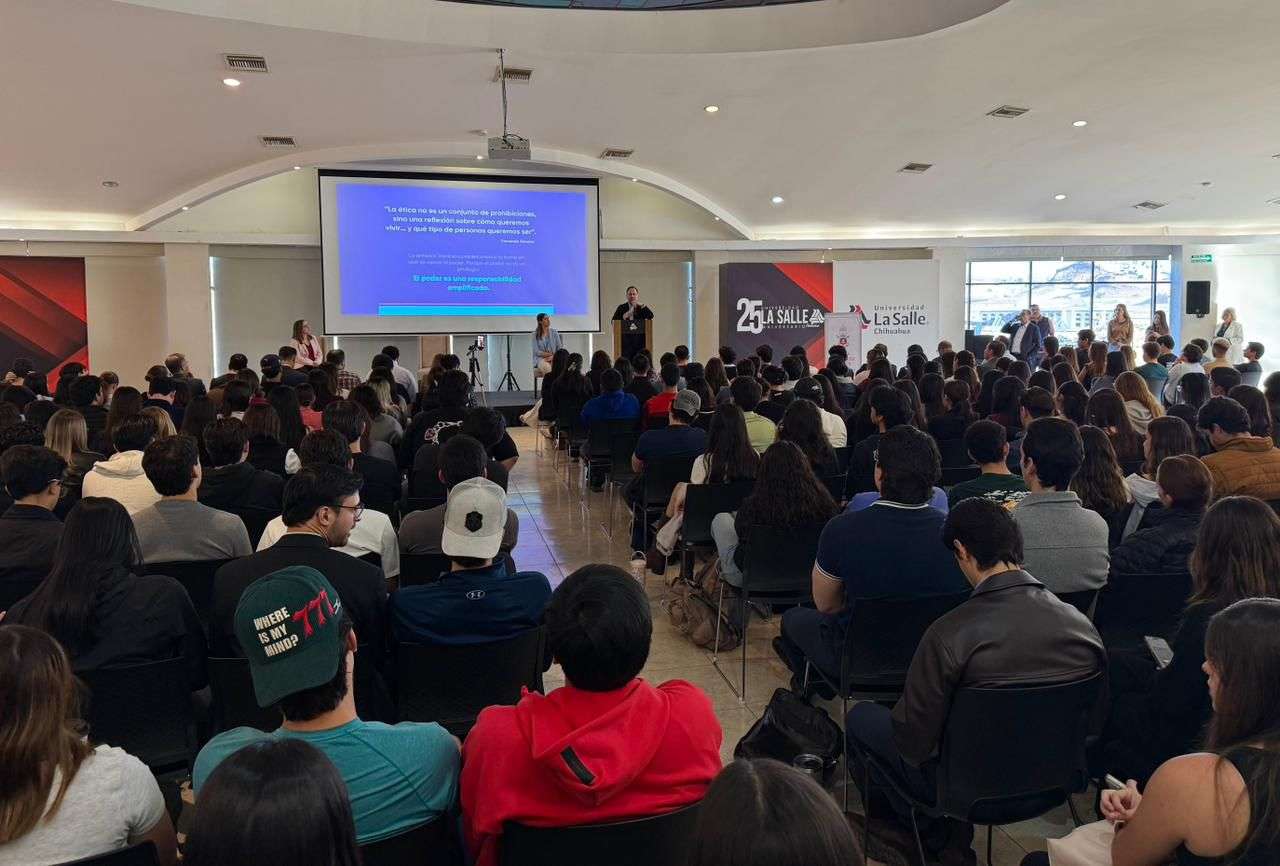 Chihuahua.- En el marco del “Mes de la Ética 2026 organizado por Phi Delta Phi” en la Universidad La Salle Chihuahua, el Secretario General de Gobierno, Santiago De la Peña, tuvo la oportunidad de sostener encuentro con más de 200 estudiantes de diferentes carreras, principalmente de la licenciatura de Derecho donde habló de la importancia de ejercer el poder con ética y responsabilidad, con la conferencia denominada ¿Cómo se toman las decisiones en el poder”.