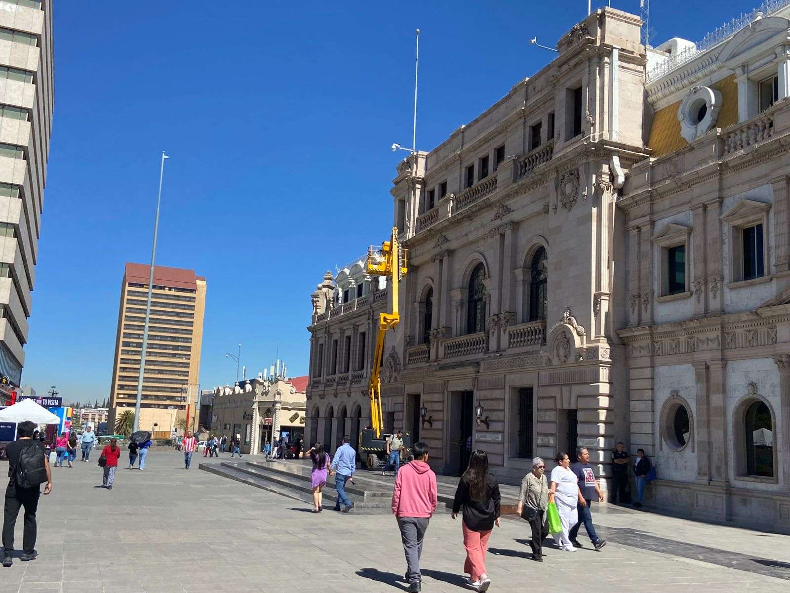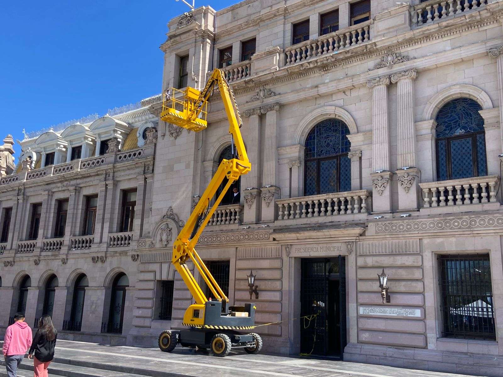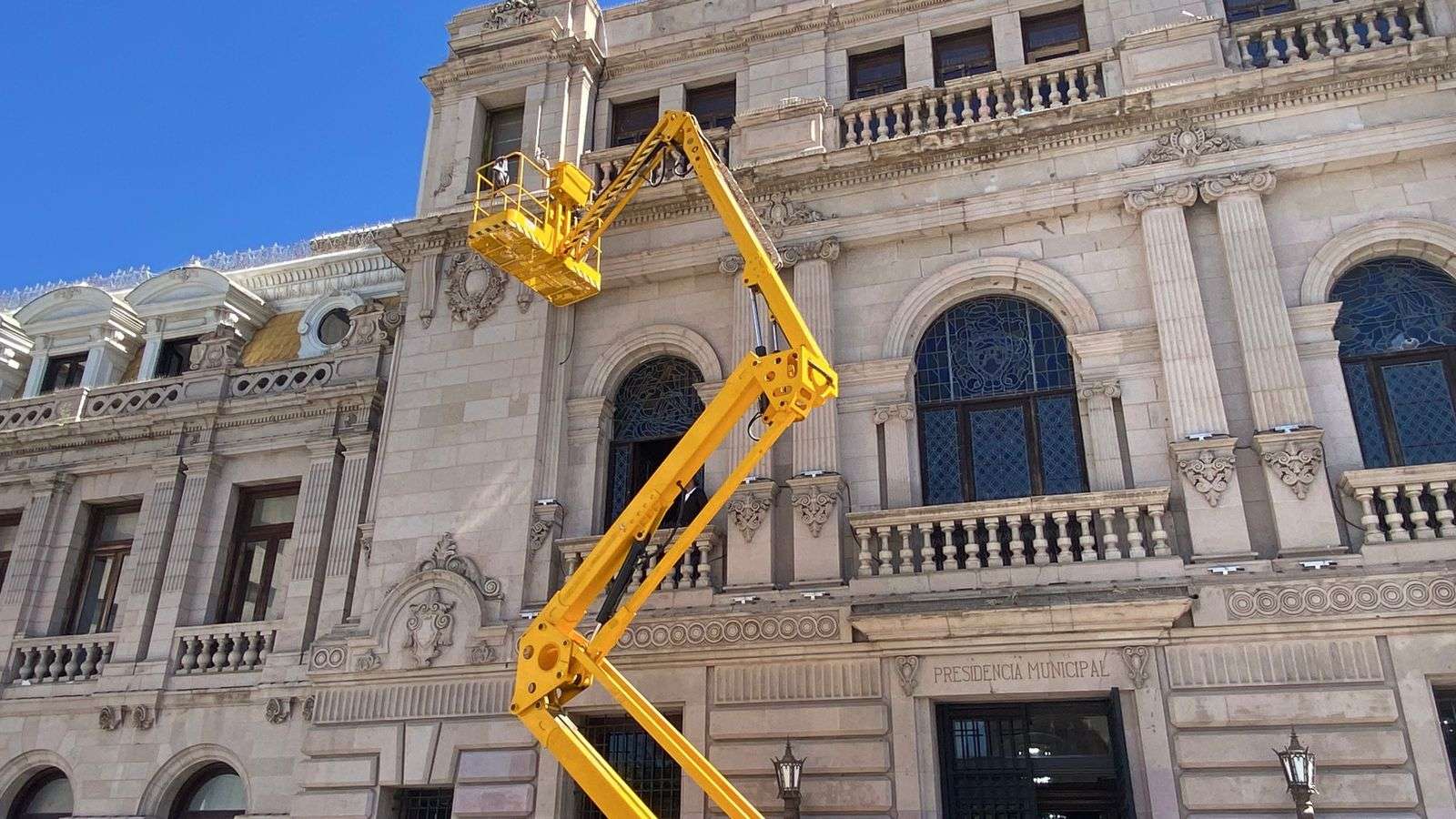 Chihuahua.- Una cuadrilla de trabajadores inició la instalación de cableado en el edificio de la Presidencia Municipal, con el objetivo de colocar lámparas LED que iluminarán la fachada de cantera.