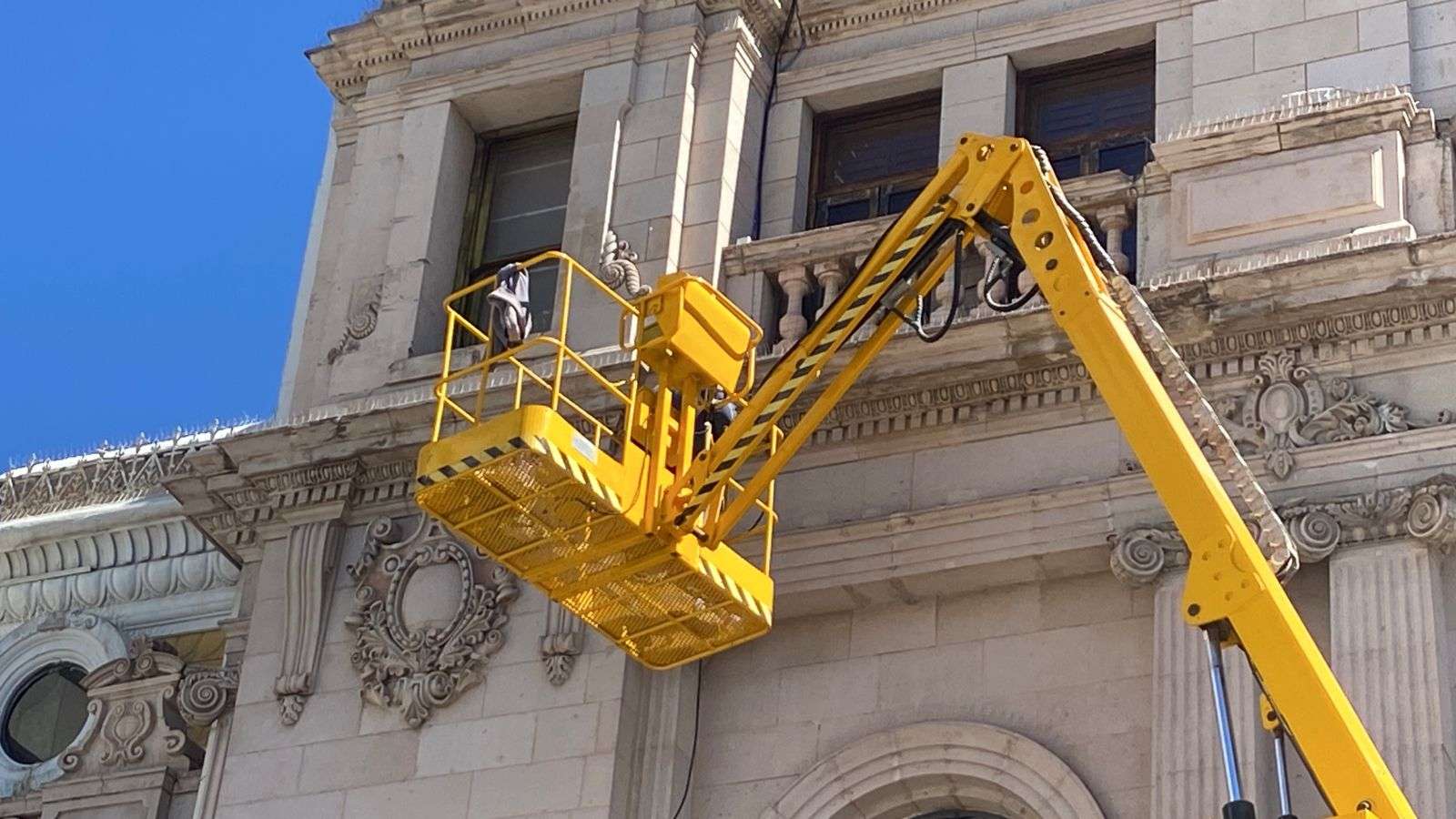 Con el apoyo de una grúa, los empleados colocaron varios metros de cable de uso rudo en la parte frontal del edificio, lo que permitirá conectar las nuevas luminarias.