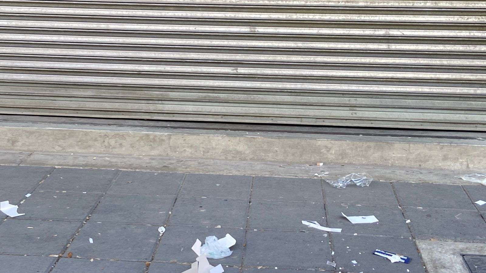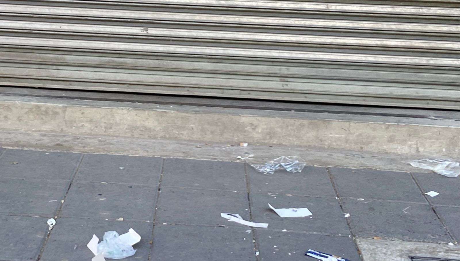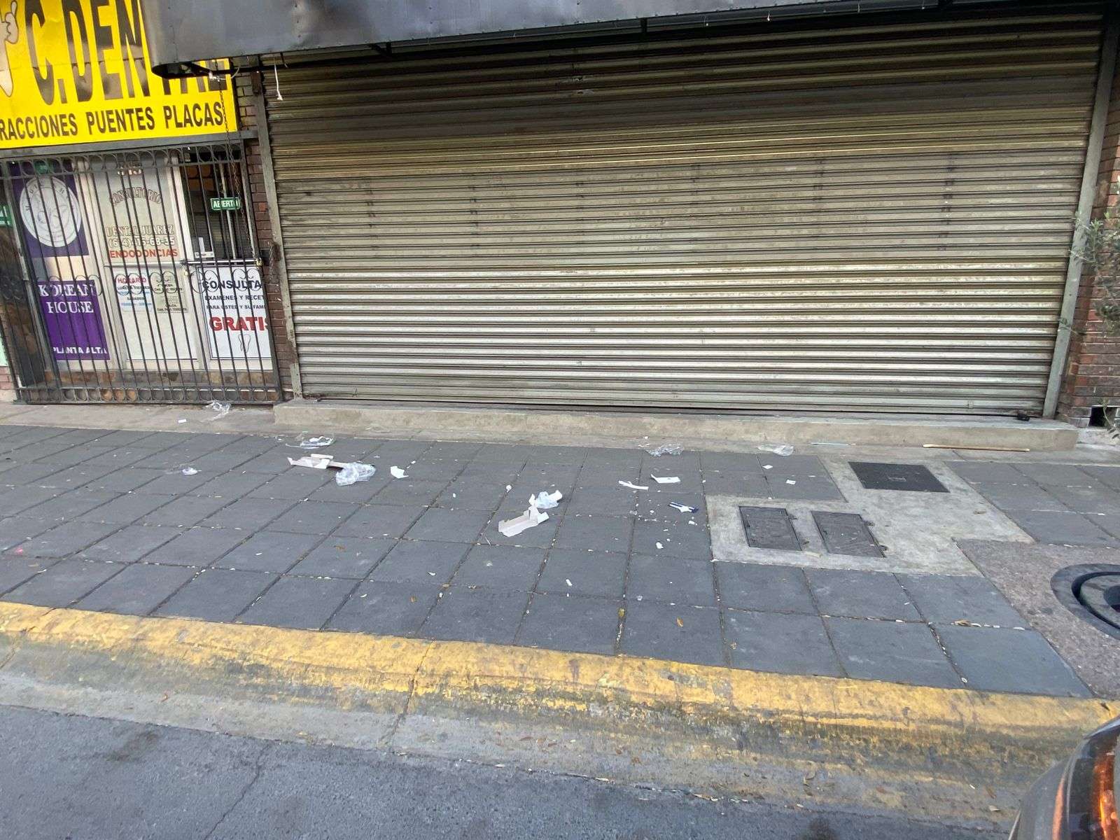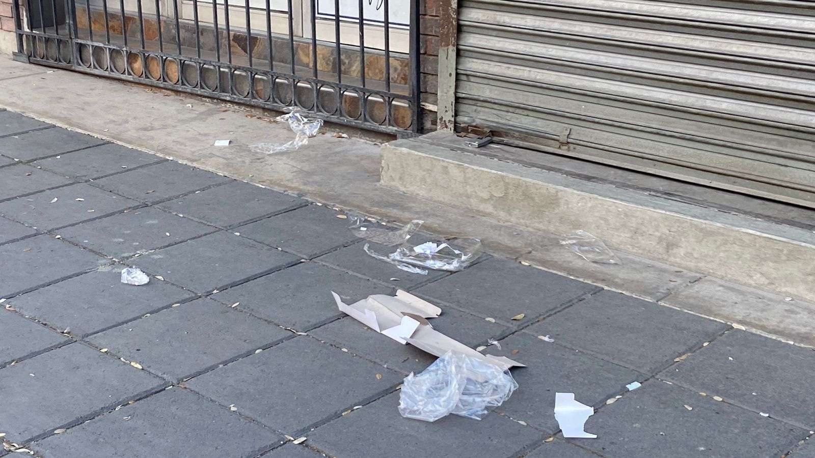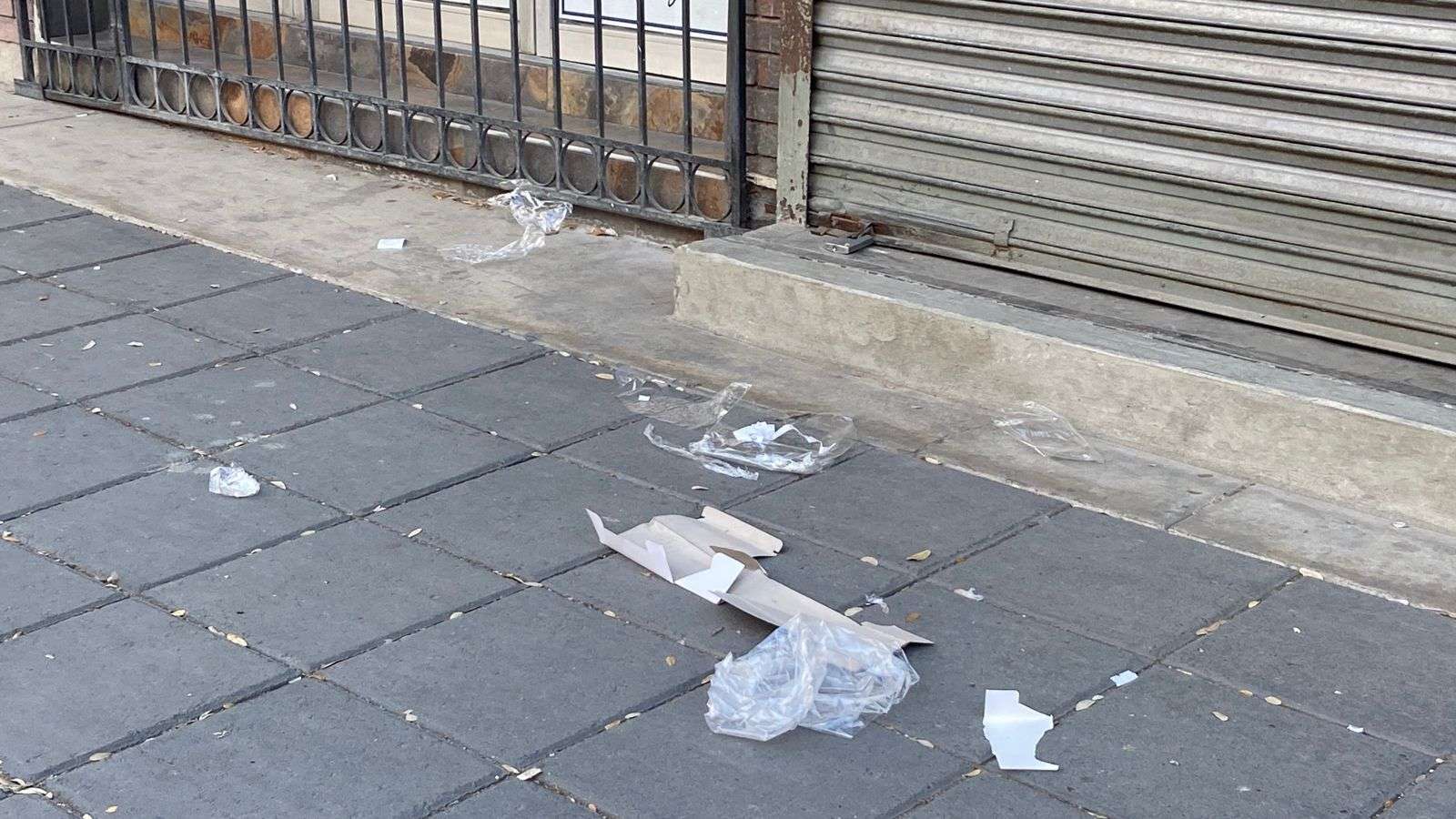 La basura observada en las calles del primer cuadro de la ciudad consistía en cartones, envoltorios plásticos y otros desechos esparcidos por la vía pública.