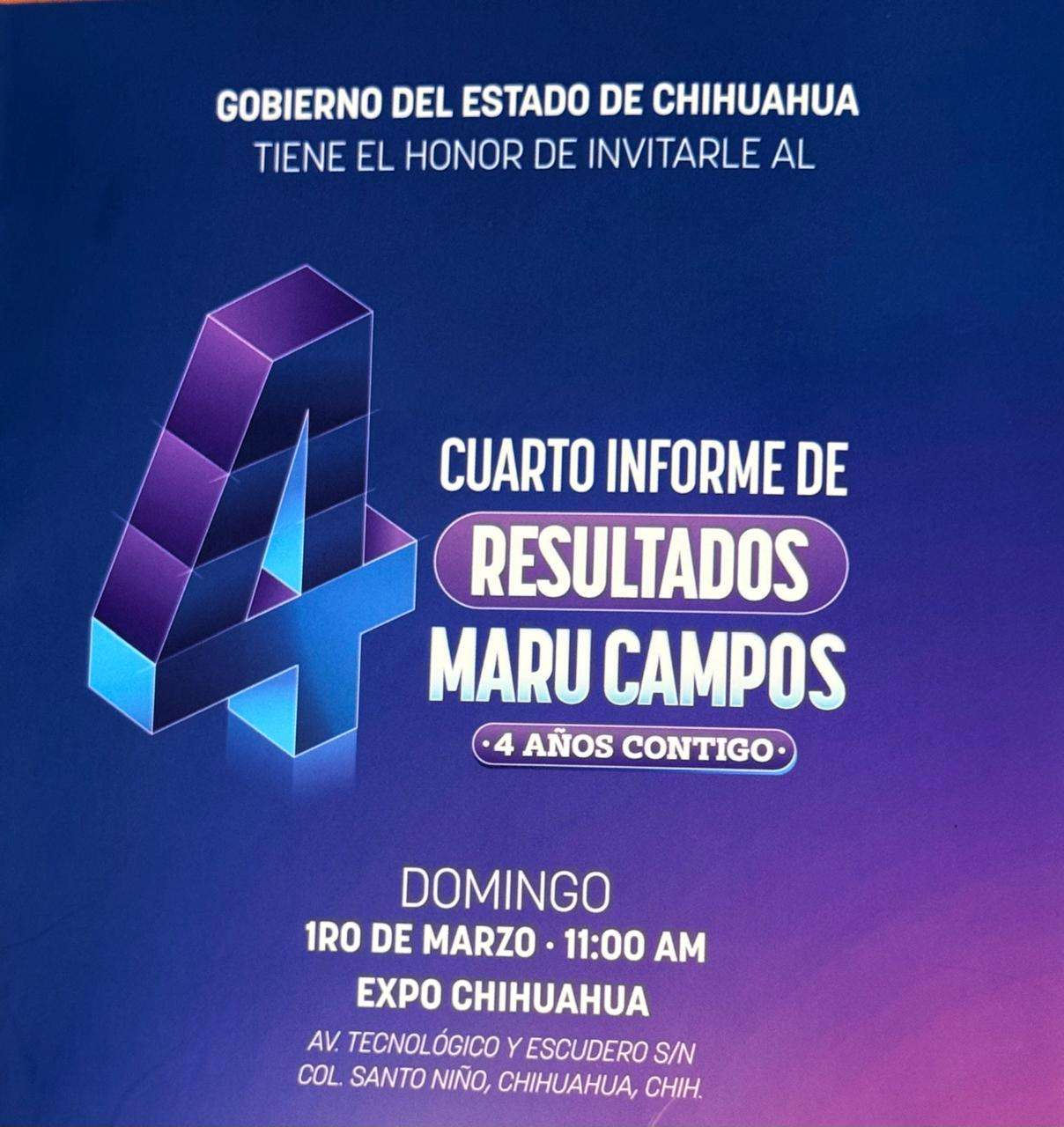 Chihuahua.- El Gobierno del Estado de Chihuahua extendió una invitación a la ciudadanía para asistir al Cuarto Informe de Resultados de la gobernadora Maru Campos, bajo el lema “4 años contigo”.
