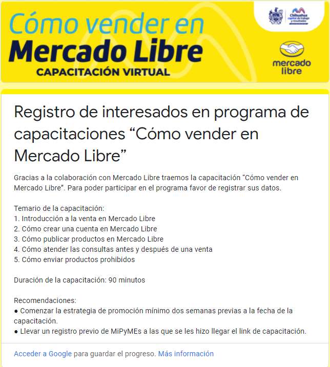 El curso lleva como título ‘’Cómo Vender en Mercado Libre’’ y hay dos fechas abiertas para inscripciones: jueves 18 de noviembre y 16 de diciembre de 2021 en punto de las 4 de la tarde.