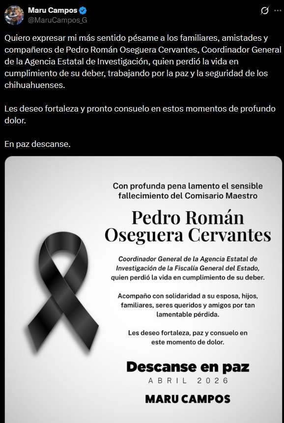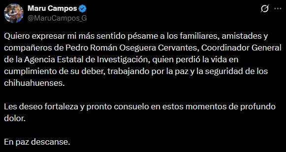 Chihuahua. - La gobernadora Maru Campos externó sus más profundas condolencias ante el sensible fallecimiento de Pedro Román Oseguera Cervantes, quien se desempeñaba como Coordinador General de la Agencia Estatal de Investigación.