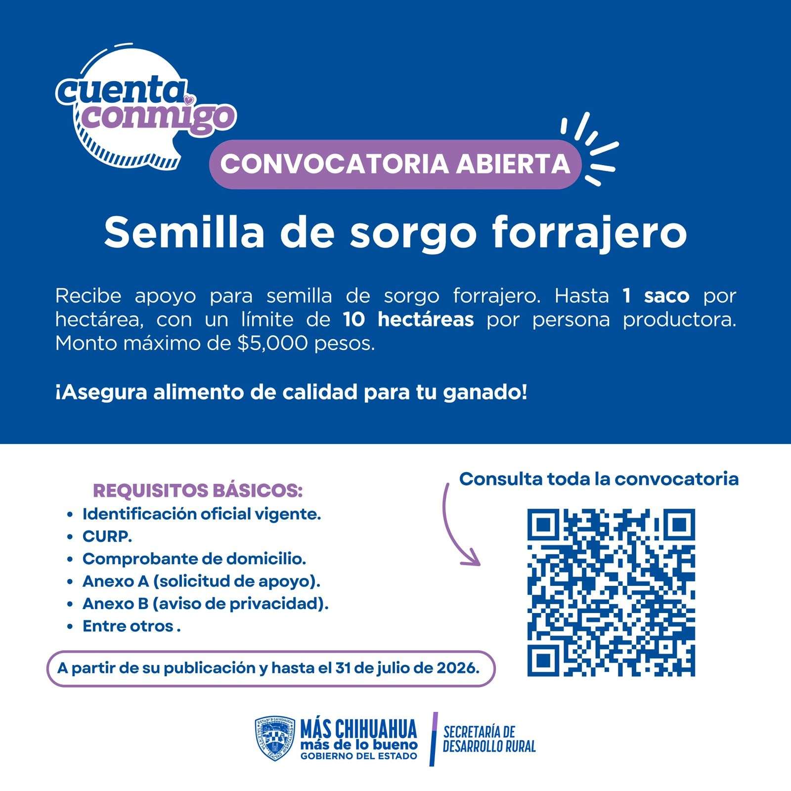 Chihuahua. - Con el objetivo de fortalecer la producción pecuaria y agrícola en el estado, la Secretaría de Desarrollo Rural (SDR), informó que ya se encuentra disponible la convocatoria para acceder al apoyo de semilla de sorgo forrajero, como parte del programa Cuenta Conmigo en el Campo.