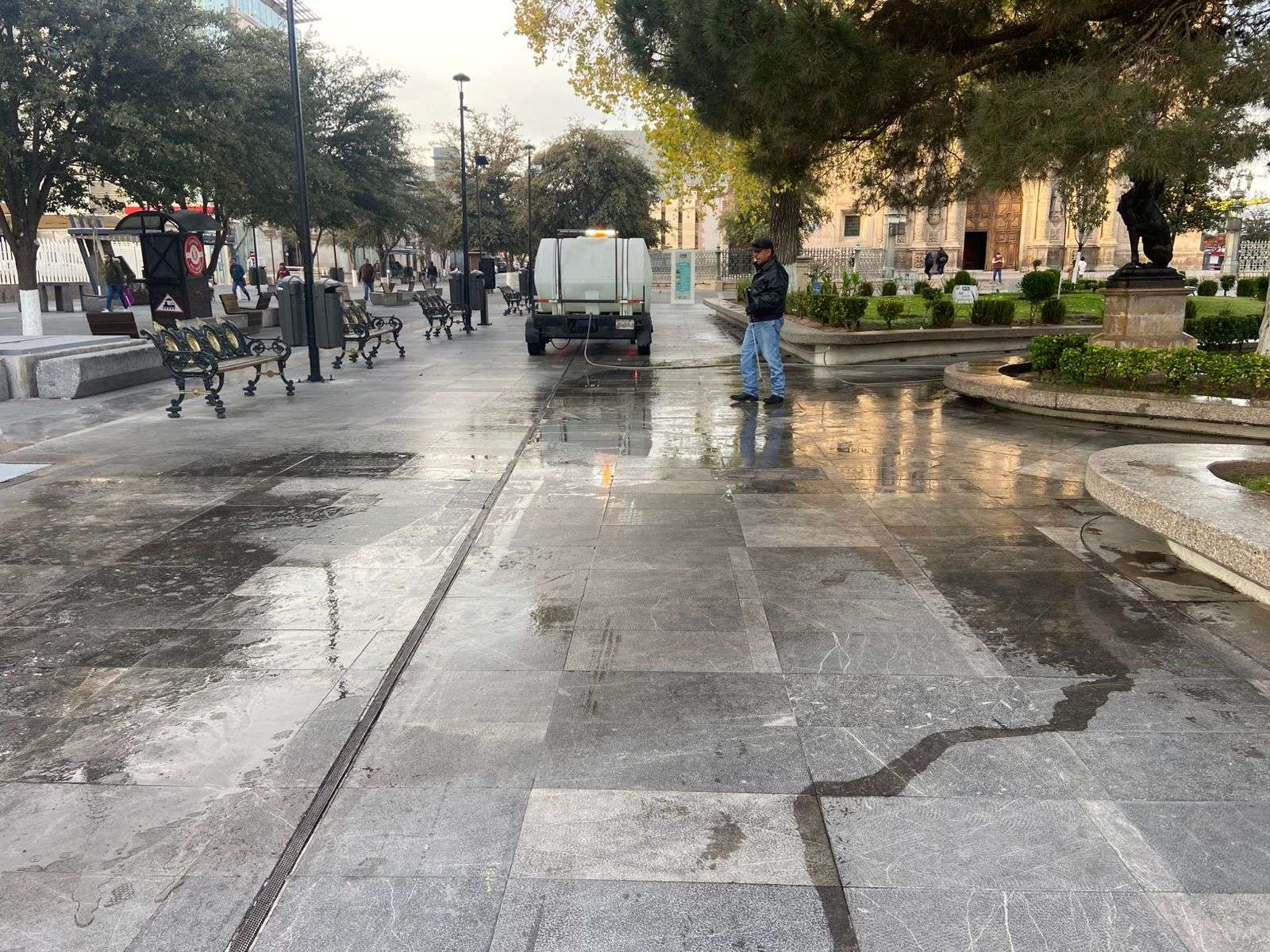 Chihuahua.– Una cuadrilla de trabajadores de la Dirección de Mantenimiento Urbano llevó a cabo labores de limpieza en la Plaza de Armas, específicamente en las calles Libertad y Victoria, con el objetivo de mantener en buen estado la imagen del centro histórico de la ciudad.
